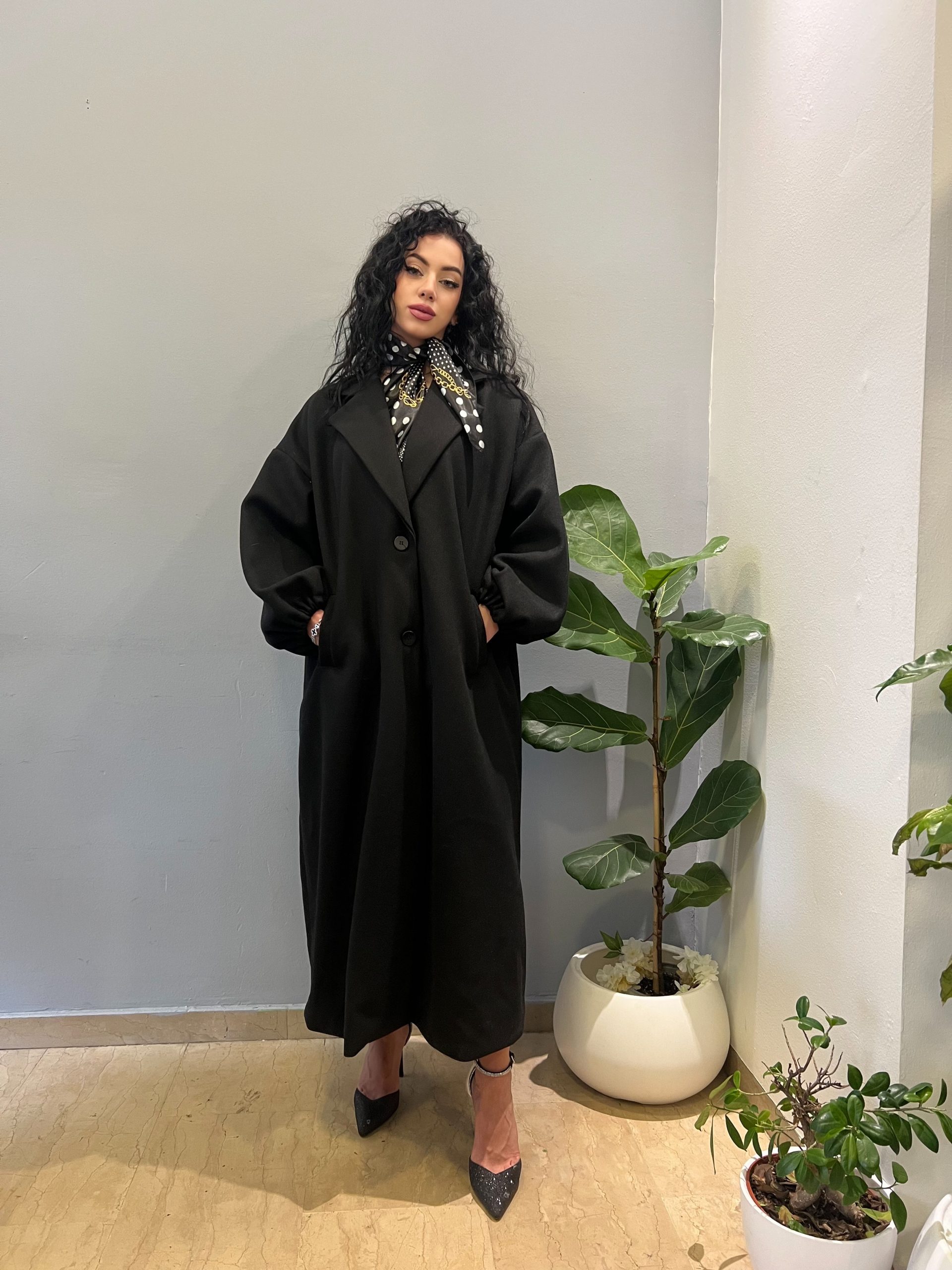 Κλασικό μαύρο παλτό one-size, σχεδιασμένο για κομψές και διαχρονικές εμφανίσεις. Διαθέτει καθαρή γραμμή, προσεγμένη εφαρμογή και κλείσιμο με κομψά κουμπιά στο μπροστινό μέρος. Τα διακριτικά φουσκωτά μανίκια προσθέτουν σύγχρονη νότα στο παραδοσιακό στυλ, προσφέροντας όγκο και χαρακτήρα χωρίς να βαραίνουν το σύνολο.
