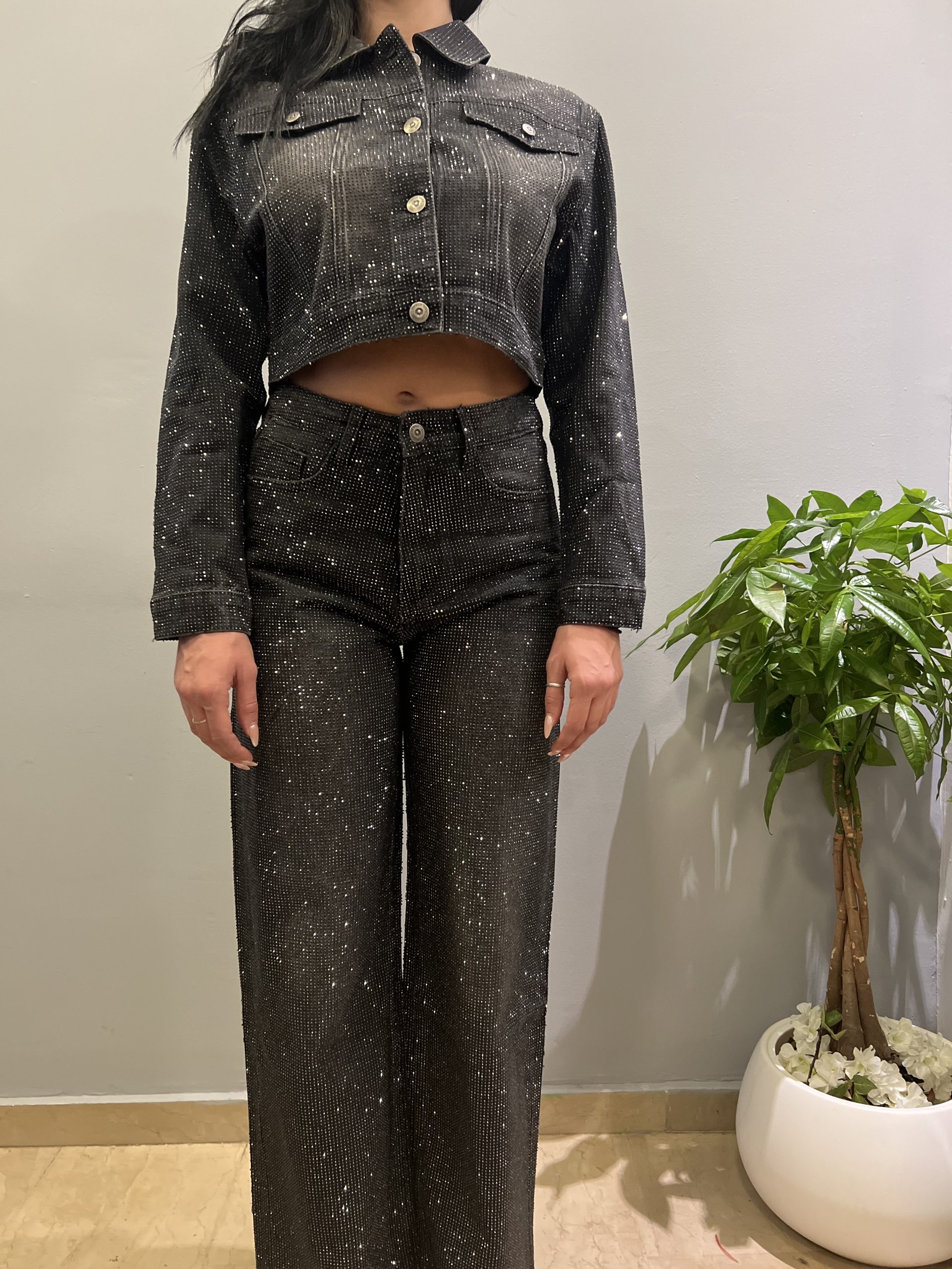 Στυλάτο cropped τζάκετ από denim με εντυπωσιακές λεπτομέρειες από στρας. Ιδανικό για να αναβαθμίσειs κάθε casual ή βραδινό outfit με μια πινελιά λάμψης.