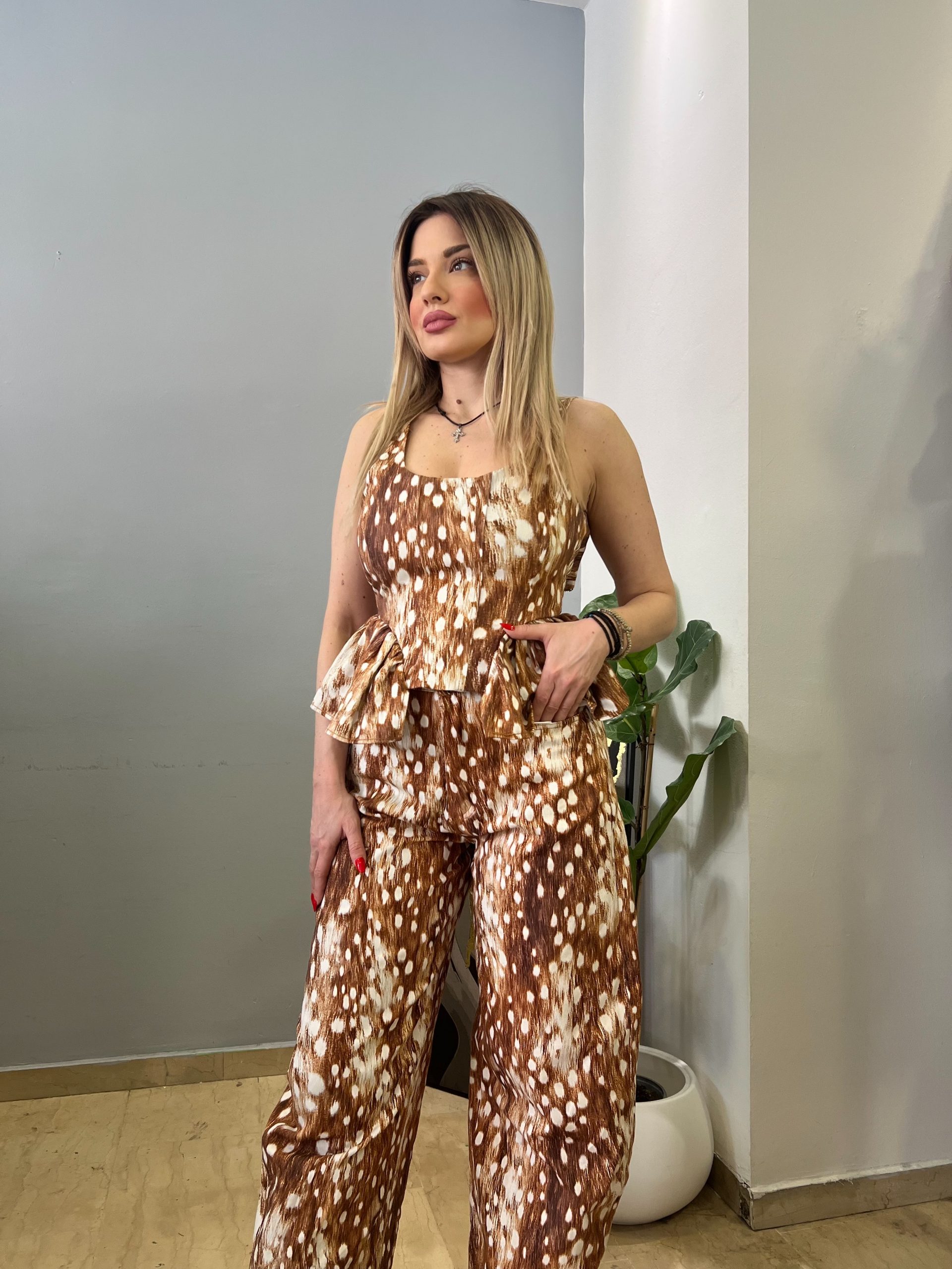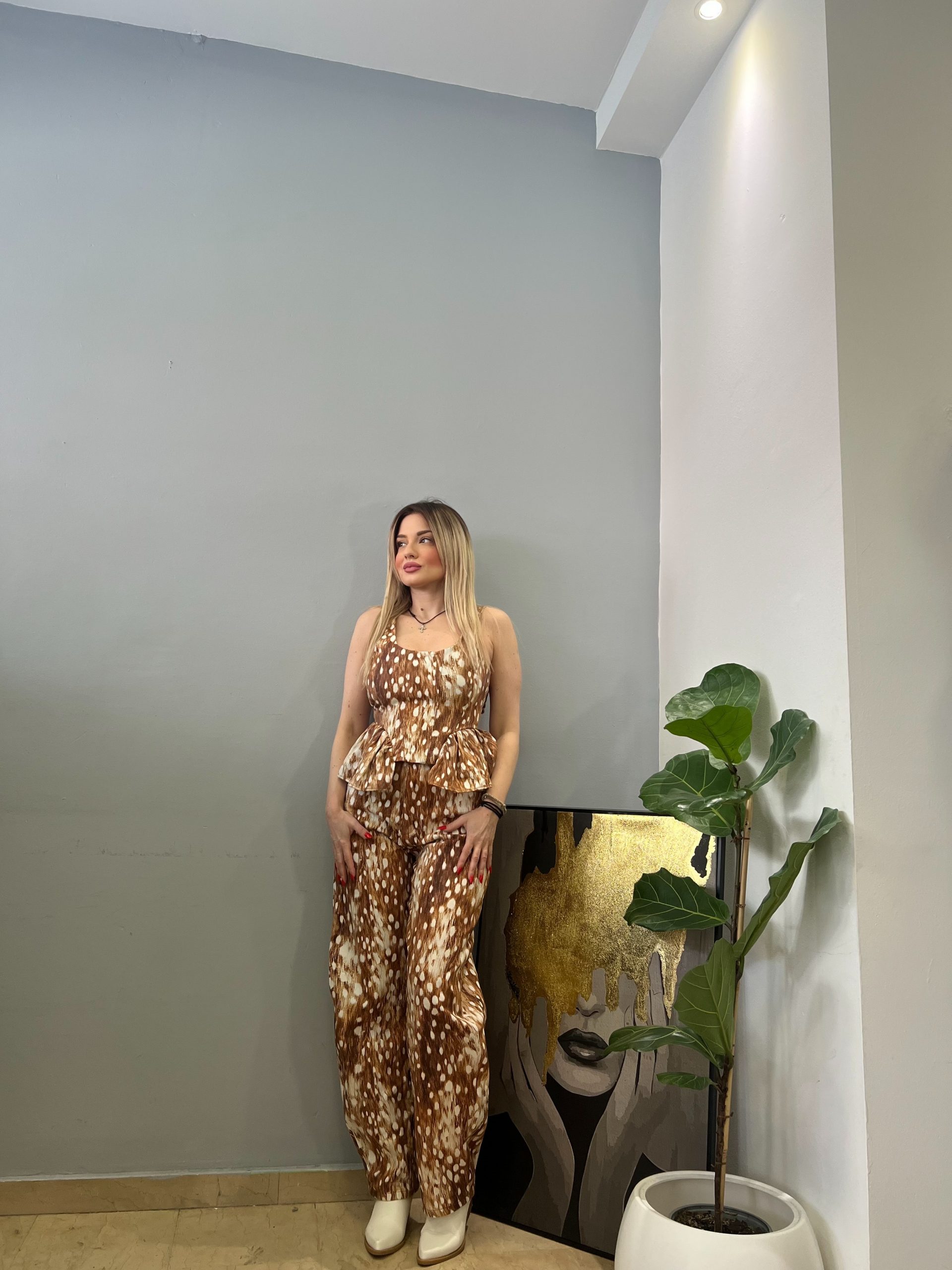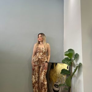 Σετ από την Lumina σε ζεστή καφέ απόχρωση, ιδανικό για άνετες και κομψές εμφανίσεις όλη την ημέρα. Το σύνολο αποτελείται από παντελόνι και τοπάκι που συνδυάζονται αρμονικά, δημιουργώντας ένα ολοκληρωμένο και ευέλικτο outfit.