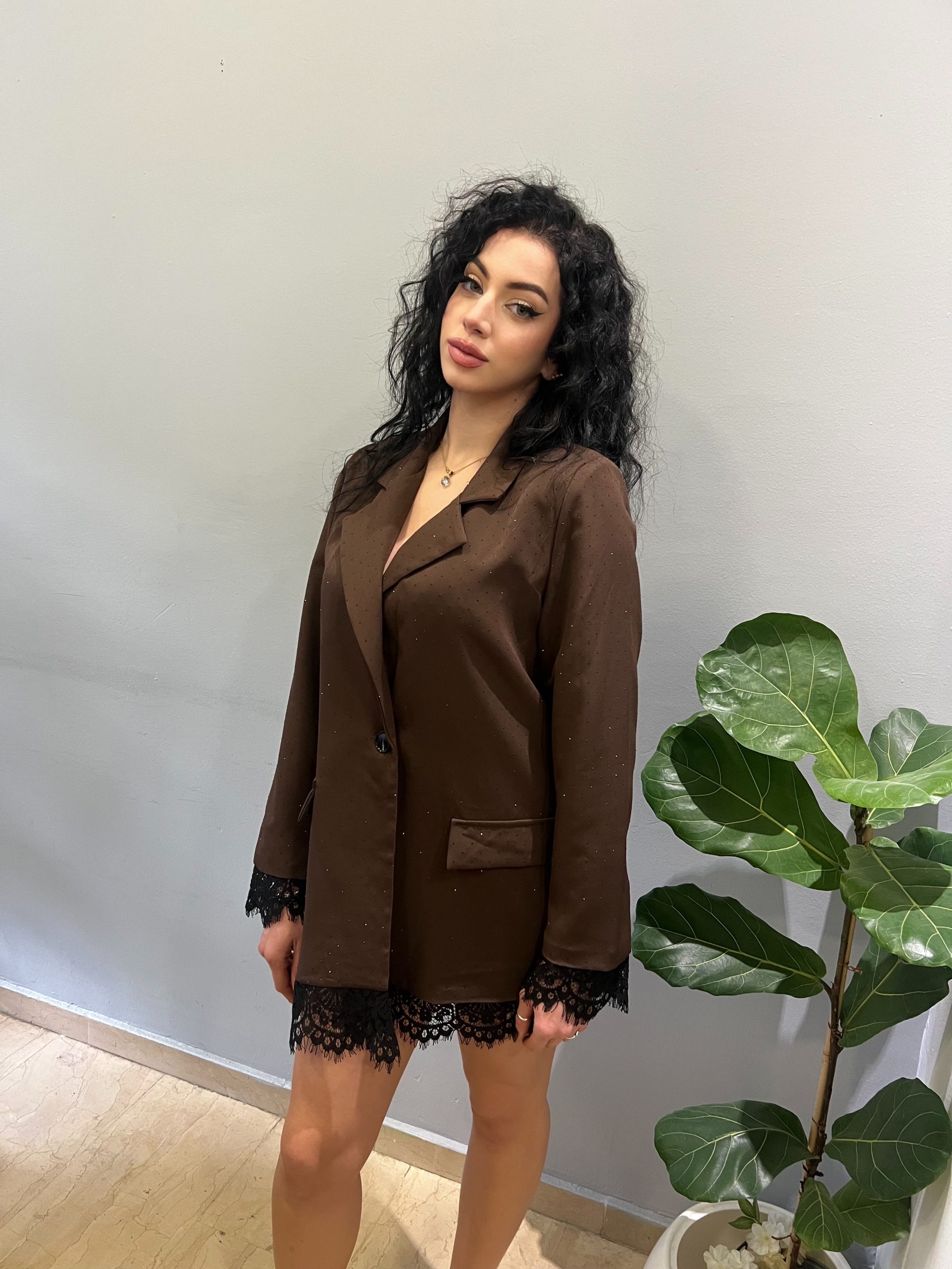 Καφέ blazer με δαντέλα στο τελείωμα, ιδανικό τόσο ως σακάκι όσο και ως φόρεμα. Έχει άνετη ίσια γραμμή, σταθερό ύφασμα και διακριτό κούμπωμα στο μπροστινό μέρος. Η δαντέλα δίνει μια θηλυκή πινελιά, ενώ το μήκος του το κάνει κατάλληλο για κομψές καθημερινές ή βραδινές εμφανίσεις. Ένα ευέλικτο κομμάτι που συνδυάζεται εύκολα με διαφορετικά στυλ.