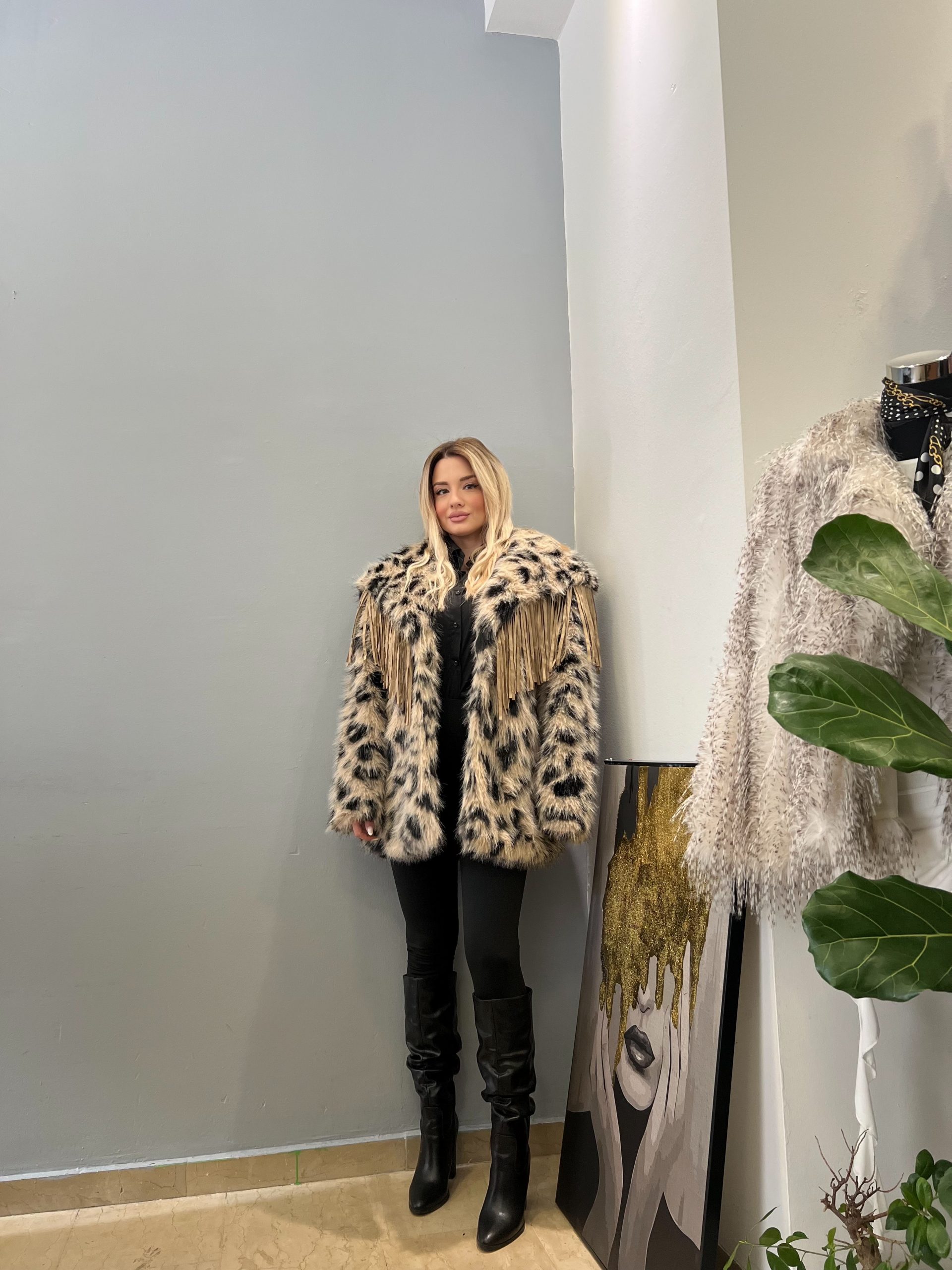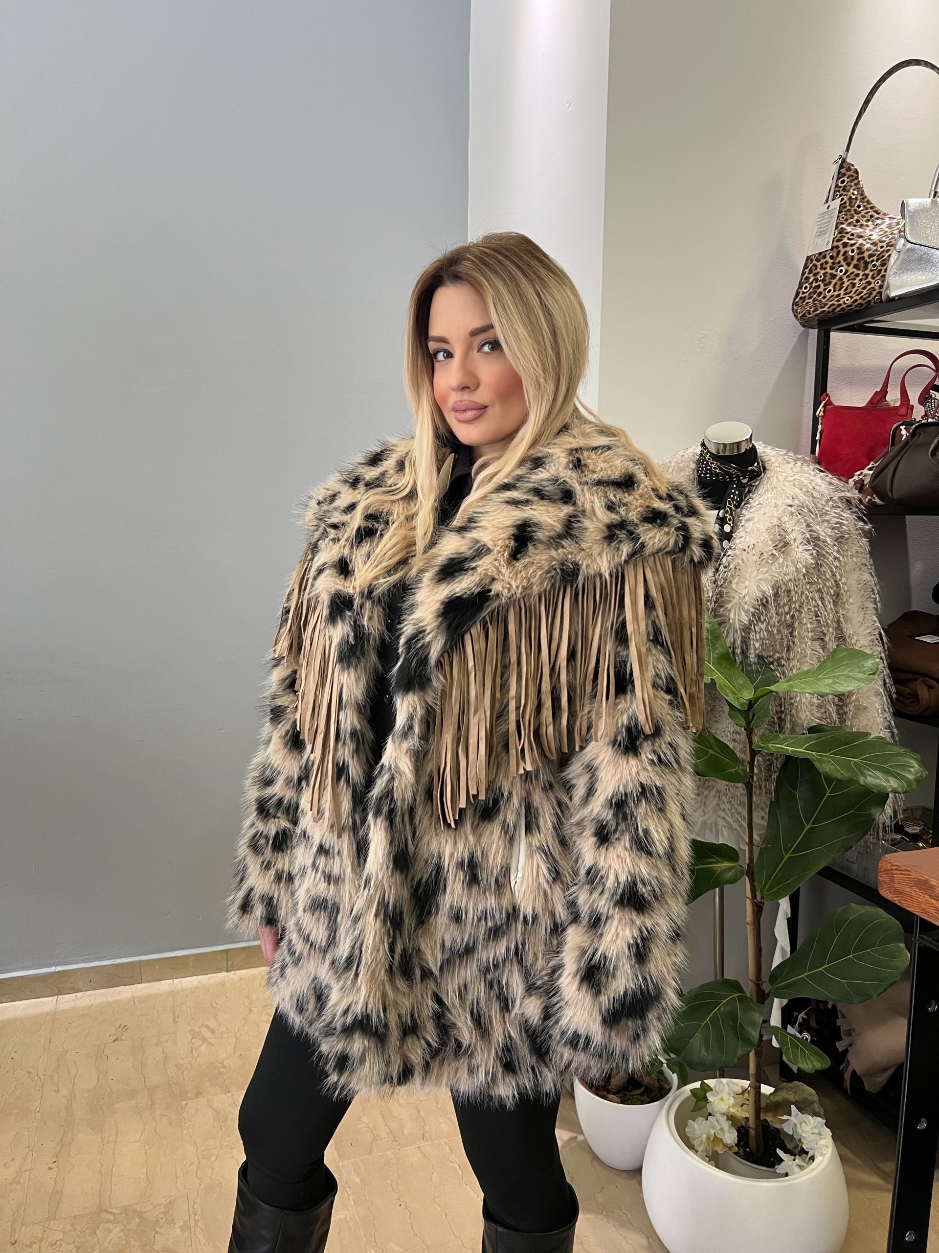 Γούνα σε συνδυασμό μπεζ με μαύρο, με μπεζ κρόσσια που προσθέτουν κίνηση και στιλ. Άνετη εφαρμογή one size, κατάλληλη για διαφορετικούς σωματότυπους. Μοντέρνα επιλογή που συνδυάζεται εύκολα με καθημερινά αλλά και πιο ιδιαίτερα σύνολα.
