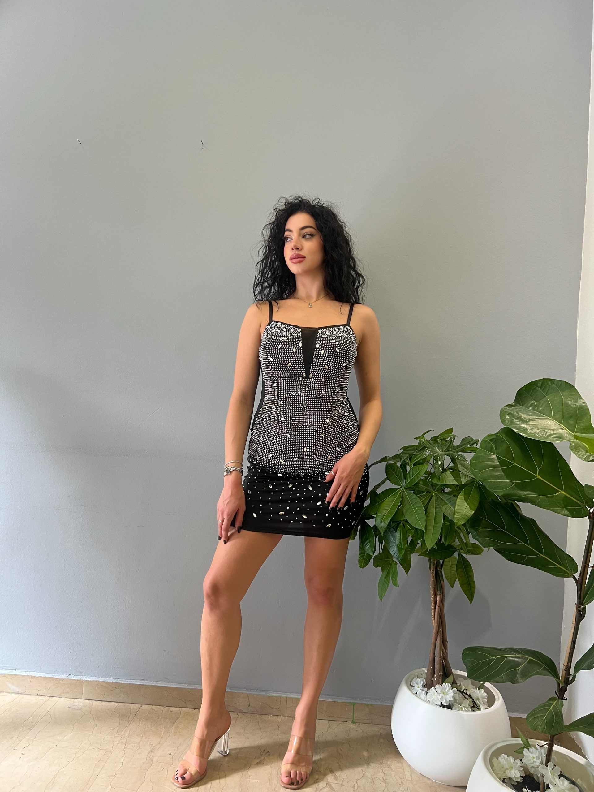 Μαύρο κοντό φόρεμα με στράς και διαμαντάκια στο μπροστινό μέρος. Εφαρμοστό κόψιμο, ελαστικό ύφασμα. One size, καλύπτει μέχρι medium. Ιδανικό για βραδινές εμφανίσεις.