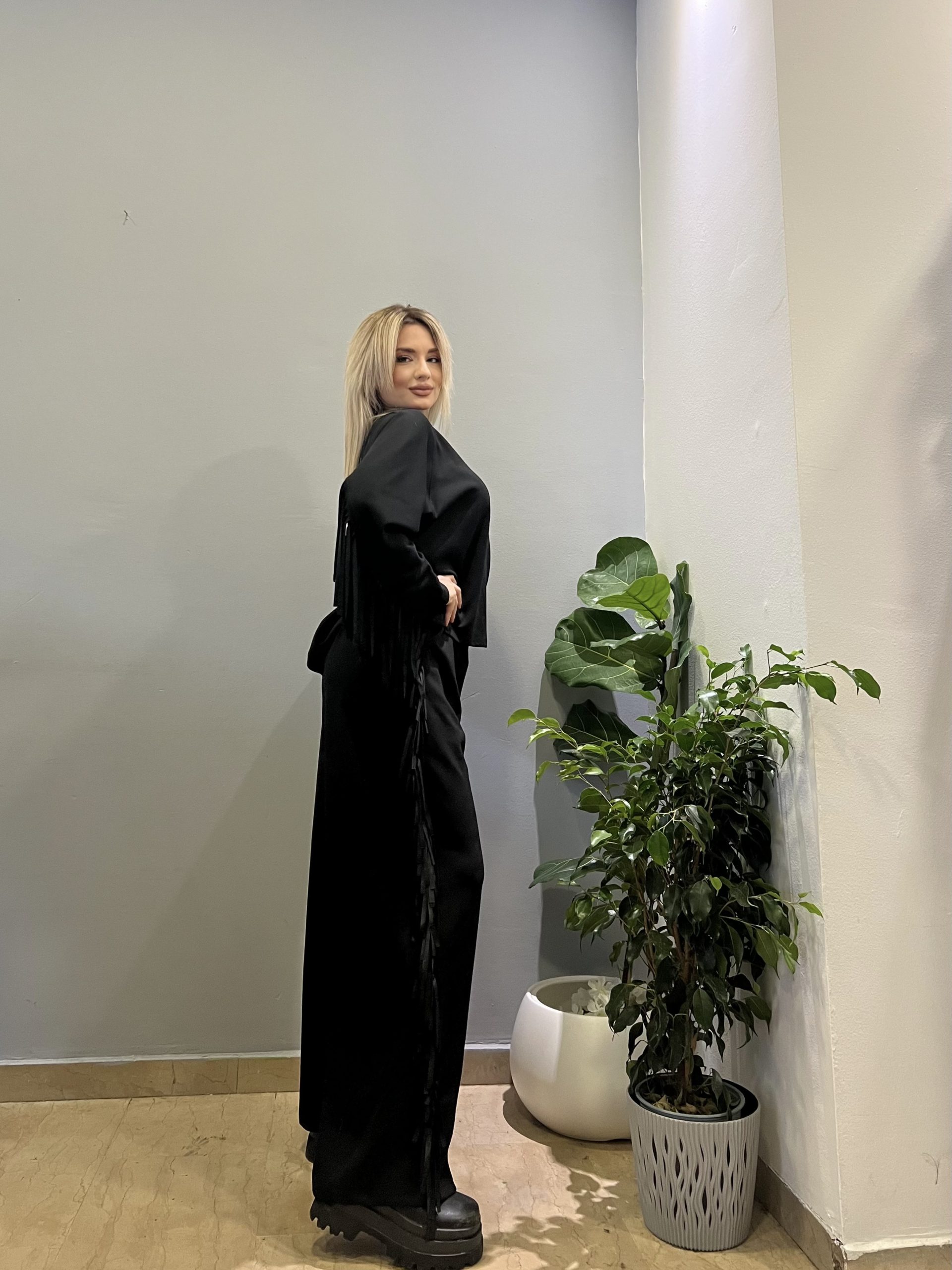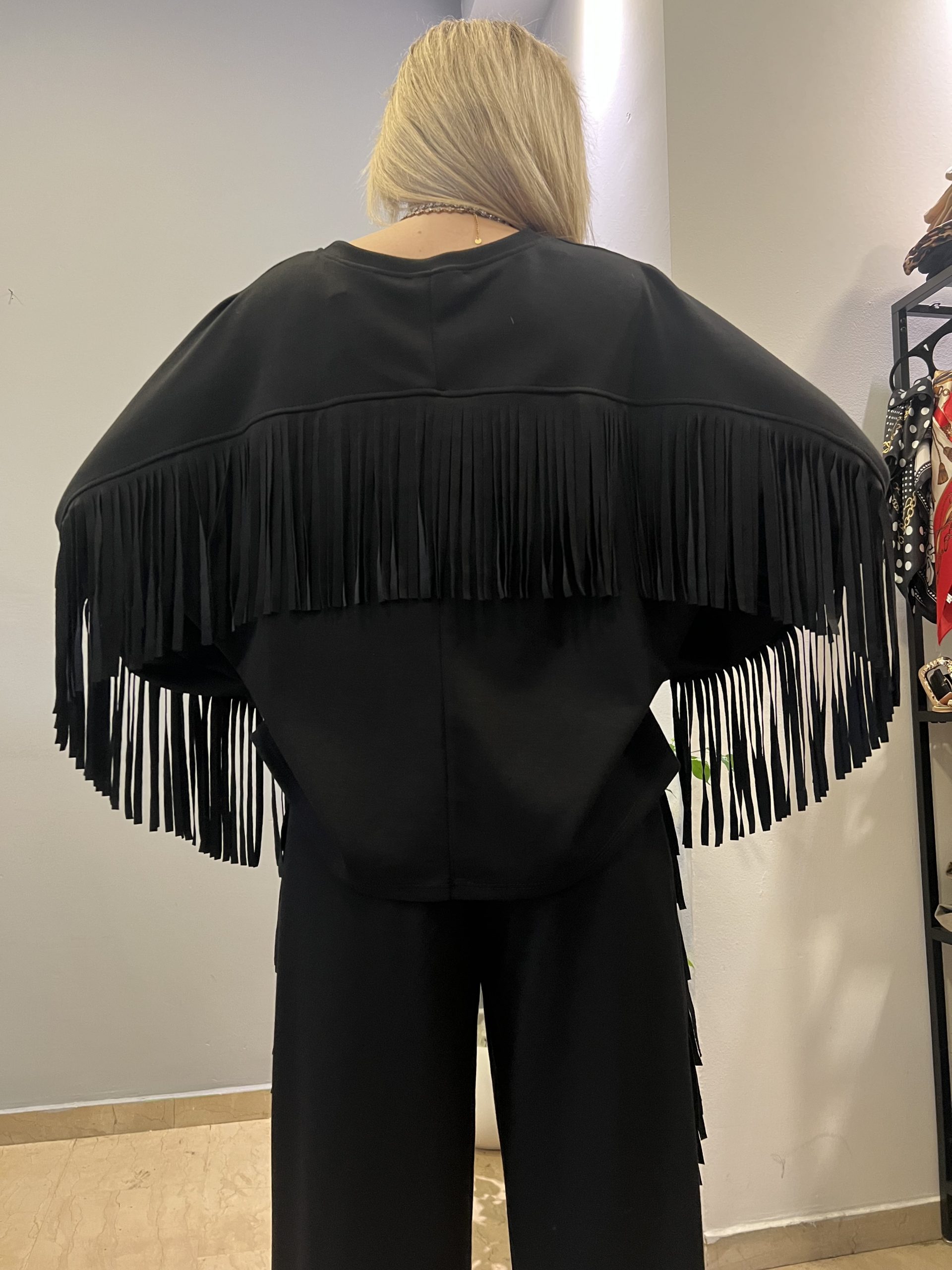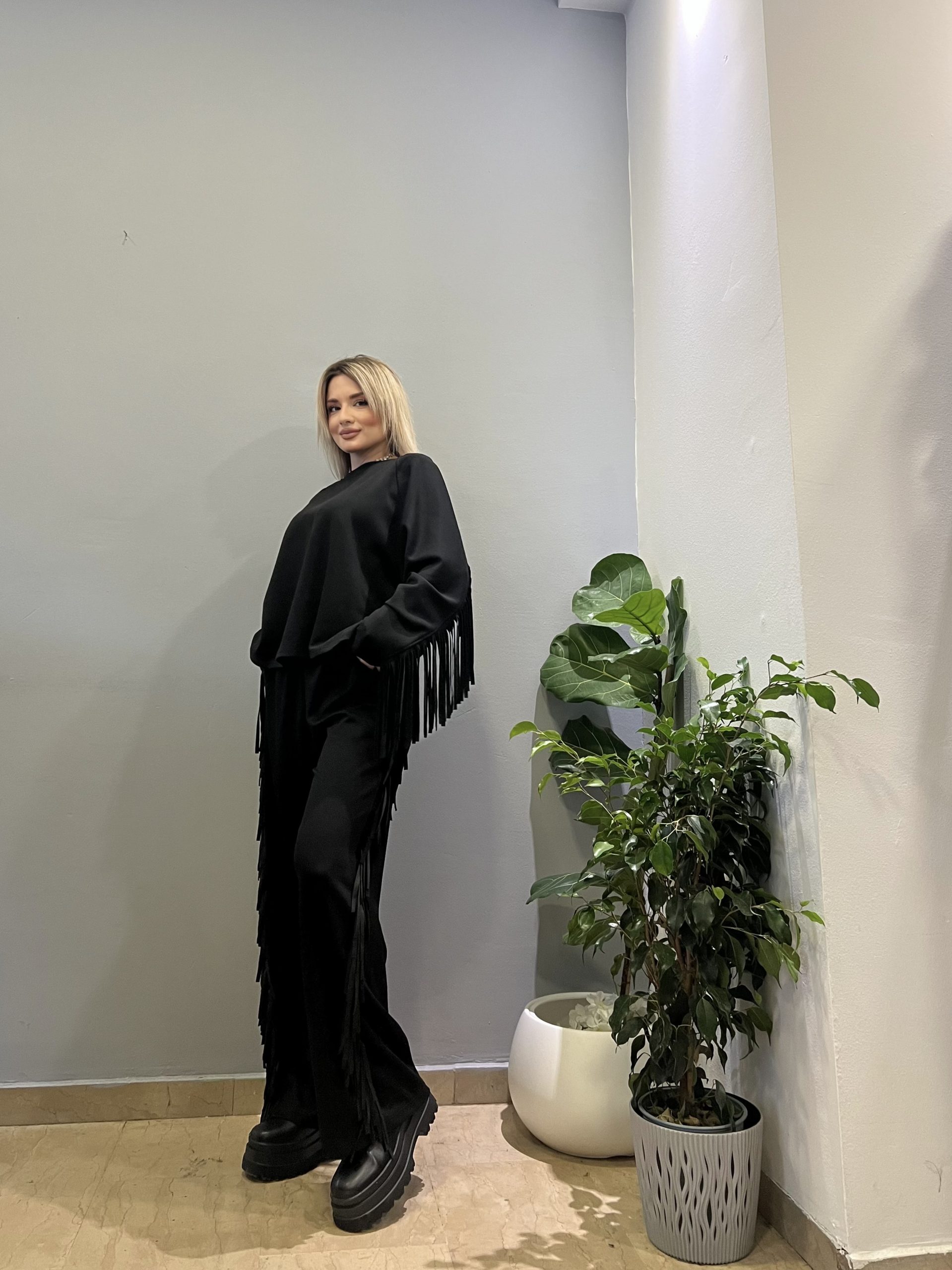 Μαύρο σετάκι one size με υπέροχα κρόσια που χαρίζουν κίνηση και στυλ! Το μπλουζάκι και το παντελόνι συνδυάζονται τέλεια για ένα μοναδικό, εντυπωσιακό look
