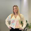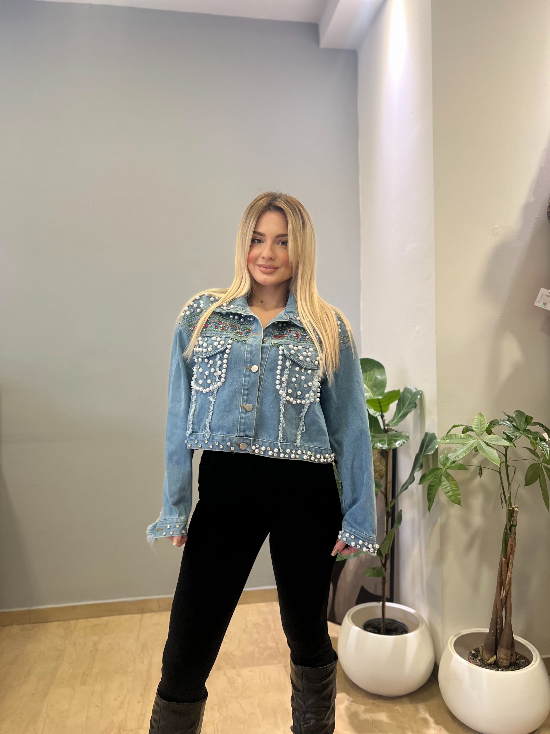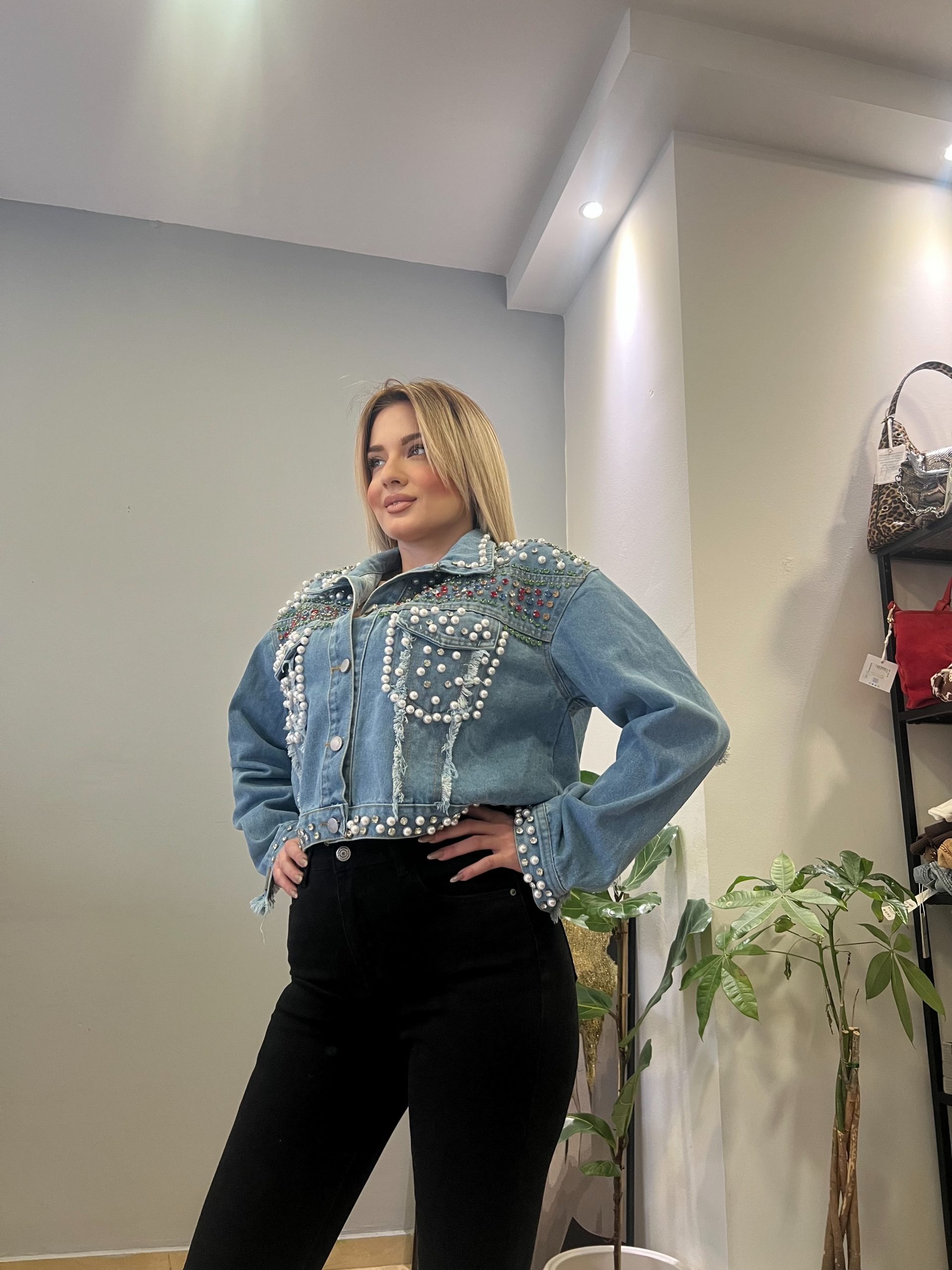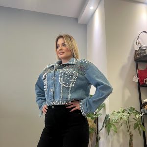 Κοντό τζιν μπουφανακι με ιδιαίτερο και ξεχωριστό χαρακτήρα. Διακοσμημένο στο μπροστινό μέρος με χάντρες και παγιέτες που χαρίζουν λάμψη και το κάνουν ιδανικό για εντυπωσιακές εμφανίσεις.