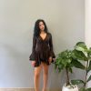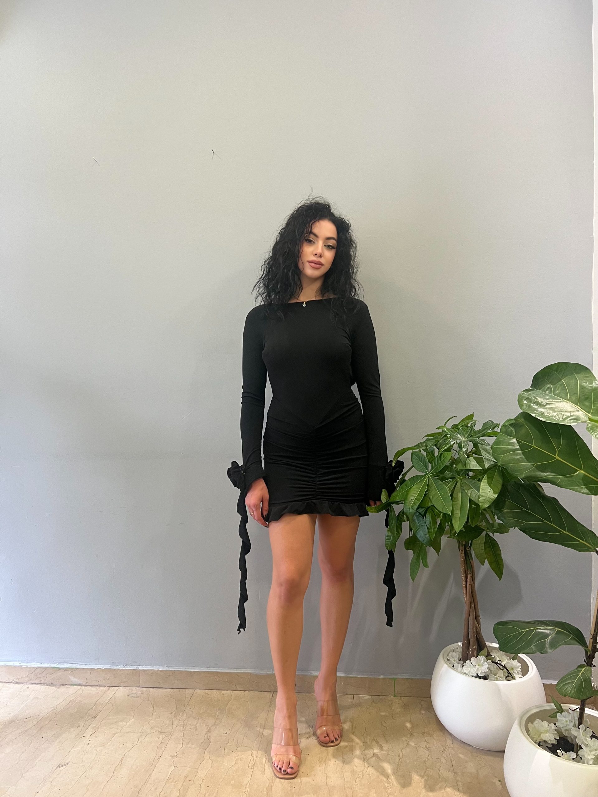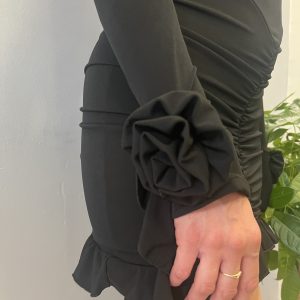 Κοντό, μαύρο φόρεμα με διαχρονική γραμμή. Διαθέτει αποσπόμενες καρφίτσες-λουλούδια στα μανίκια για διακριτική κομψότητα. One size, καλύπτει έως medium.
