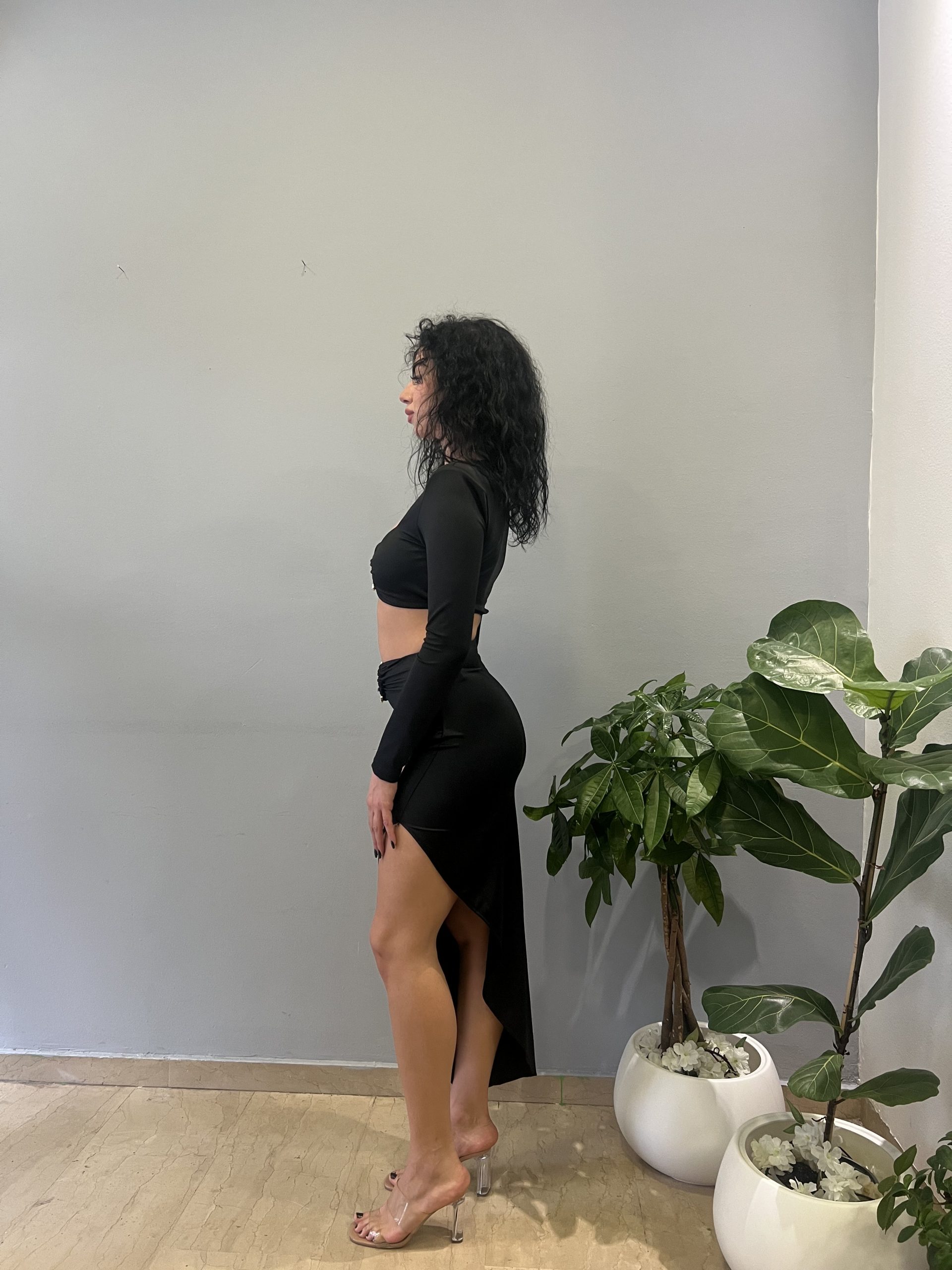 Μαύρο σετάκι one size με χρυσές λεπτομέρειες — τοπάκι και φούστα που συνδυάζουν κομψότητα και στιλ για εντυπωσιακές εμφανίσεις.