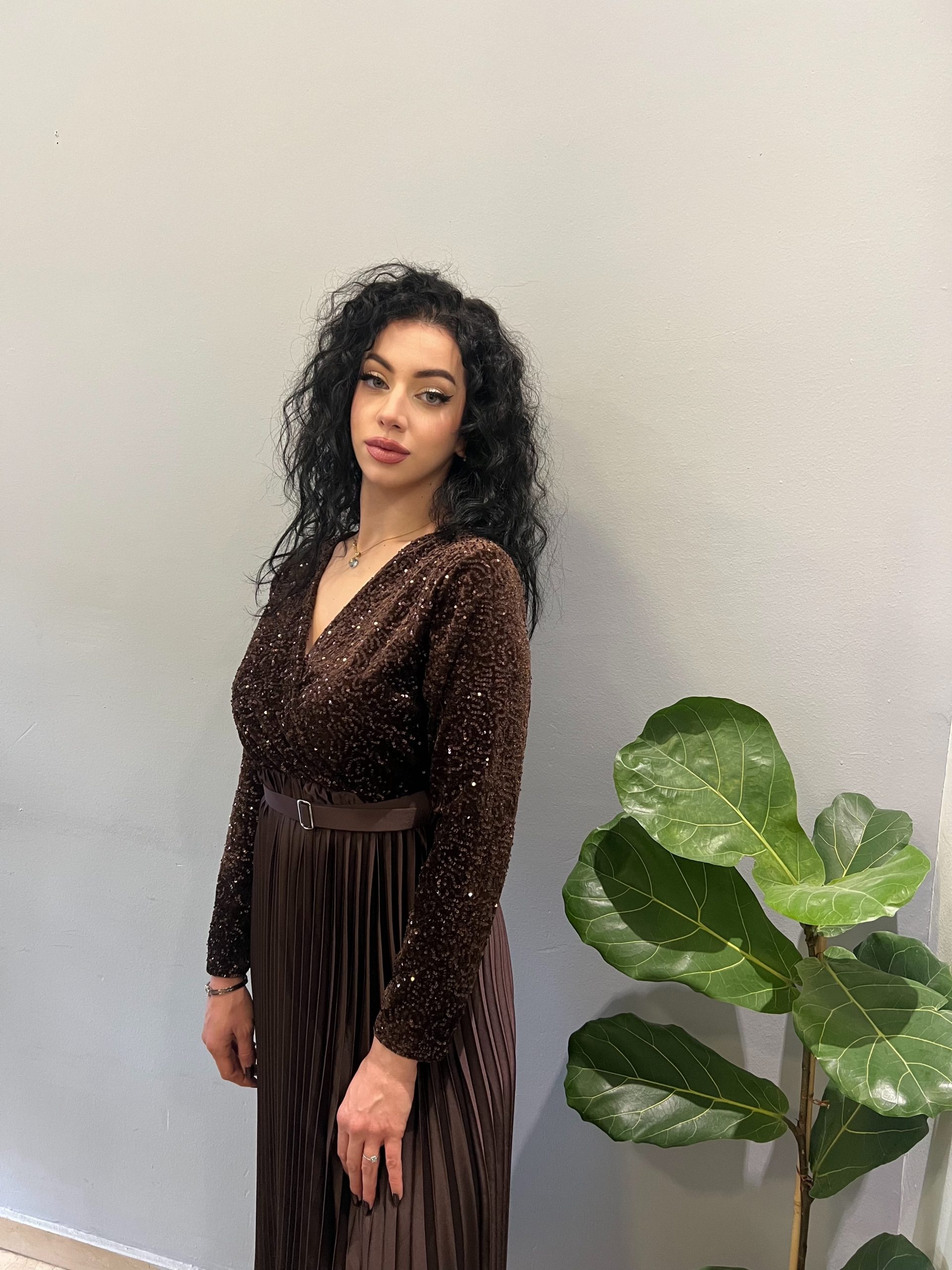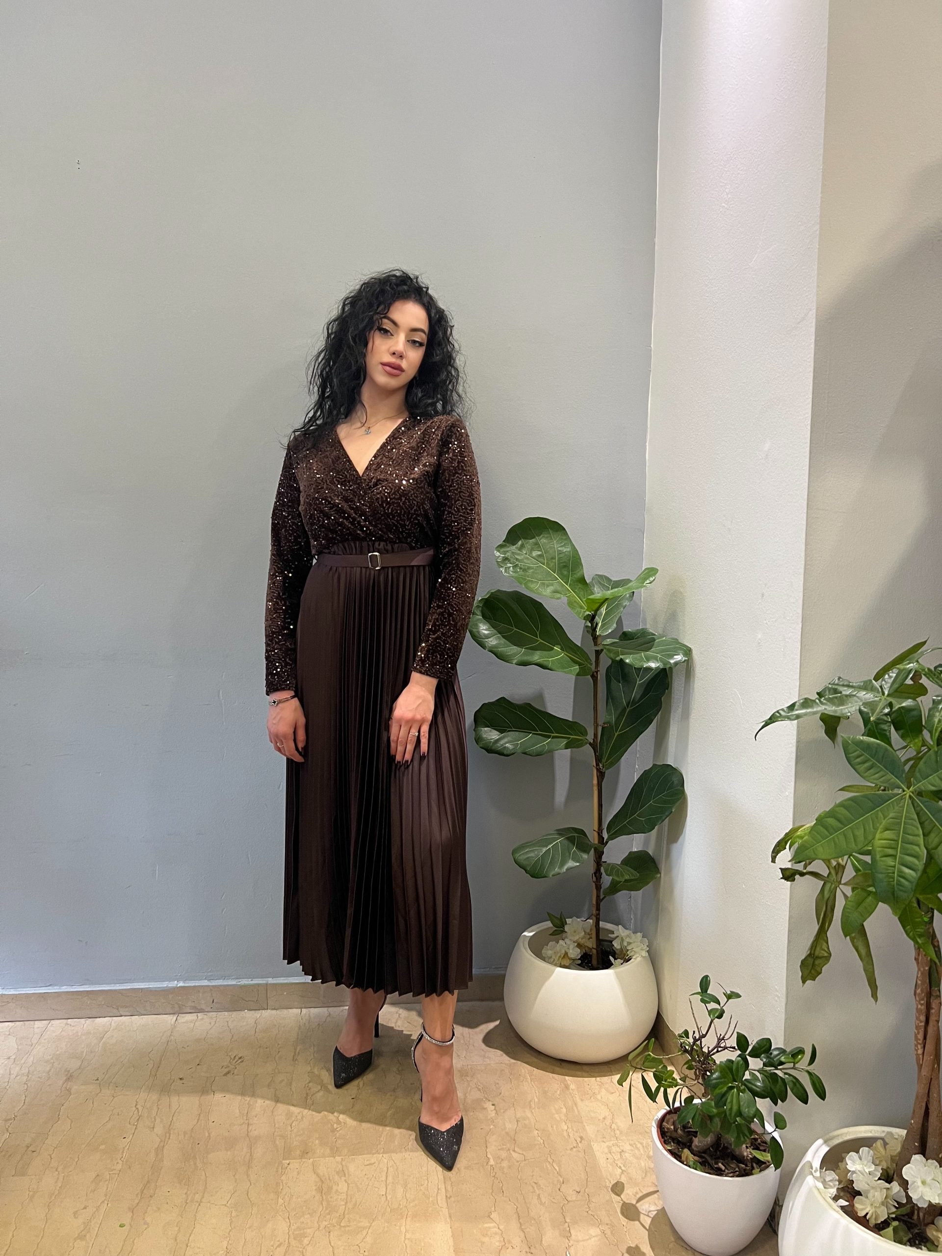Φόρεμα με εντυπωσιακό επάνω μέρος από λαμπερή παγέτα, που προσφέρει πολυτελή και κομψή εμφάνιση. Διαθέτει διακριτικό ζωνάκι στη μέση που αναδεικνύει τη σιλουέτα, ενώ η φούστα σε πλισέ γραμμή χαρίζει αέρινη κίνηση και θηλυκότητα. Μια επιλογή ιδανική για επίσημες εμφανίσεις και ιδιαίτερες περιστάσεις, συνδυάζοντας άνεση και εκλεπτυσμένο στιλ.
