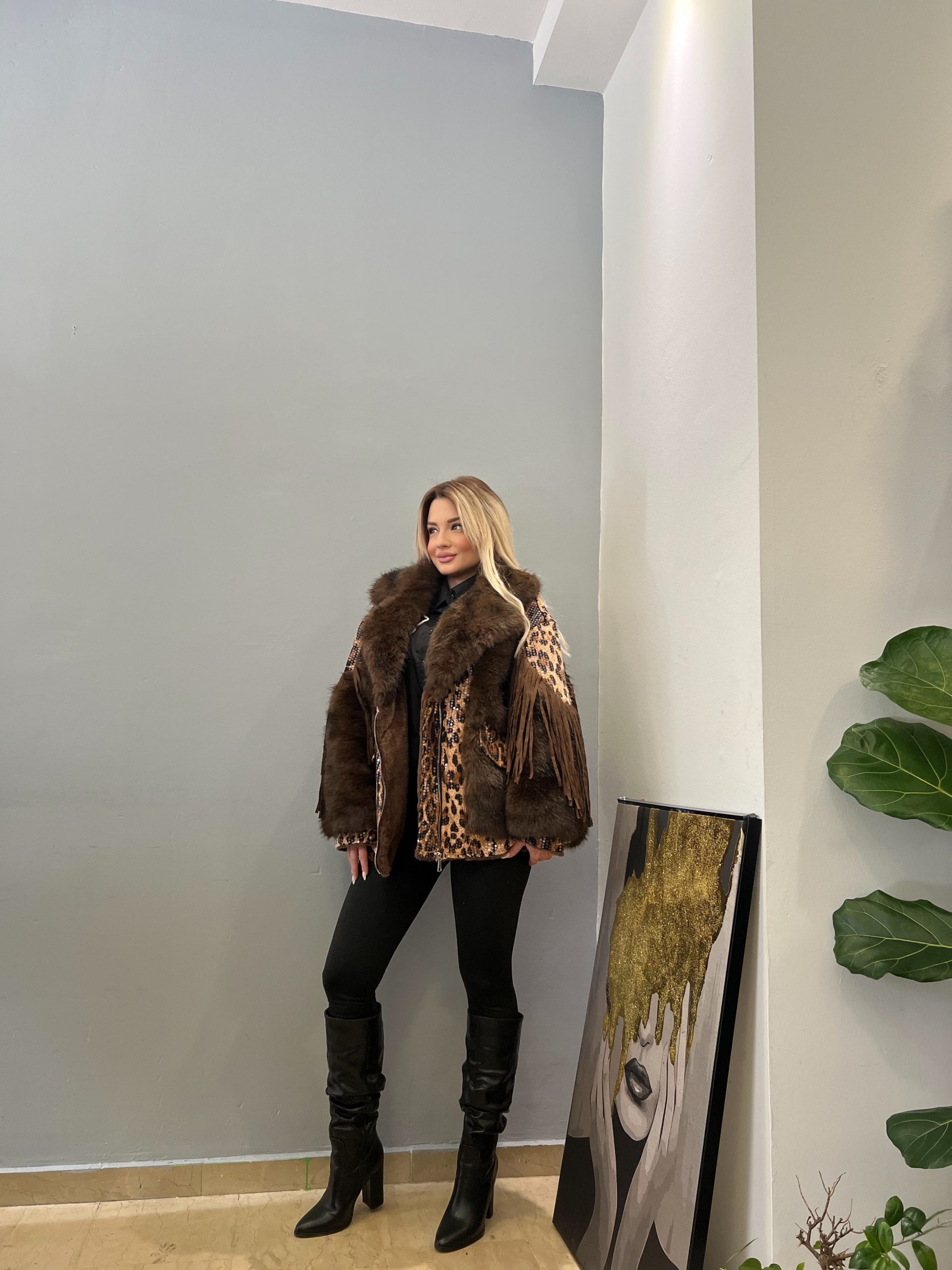 Μοναδικό μπουφανάκι με κρόσσια σε ζεστή καφέ απόχρωση, που ξεχωρίζει για τις εντυπωσιακές λεπτομέρειες λεοπάρ παγέτας. Ο συνδυασμός υφών και σχεδίων χαρίζει fashion χαρακτήρα και statement εμφάνιση, ιδανική για όσες θέλουν να τραβούν τα βλέμματα. Είναι one size, με άνετη εφαρμογή που προσαρμόζεται εύκολα σε διαφορετικούς σωματότυπους. Φοριέται από το πρωί έως το βράδυ και αναβαθμίζει ακόμα και το πιο απλό outfit.