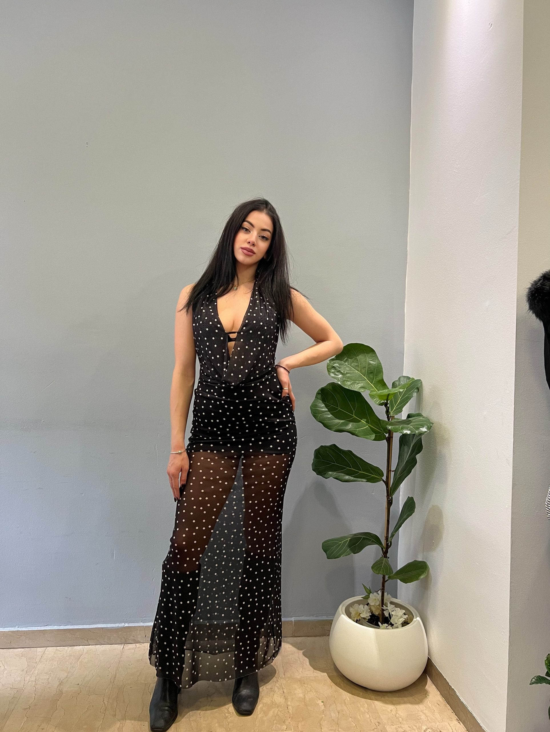 Ένα κομψό εξώπλατο φόρεμα της Lumina, με ελαφρύ ντραπέ ντεκολτέ που δίνει όμορφη κίνηση στο μπροστινό μέρος. Το κάτω μέρος διαθέτει διαφάνεια, προσθέτοντας μια διακριτική, αέρινη πινελιά.