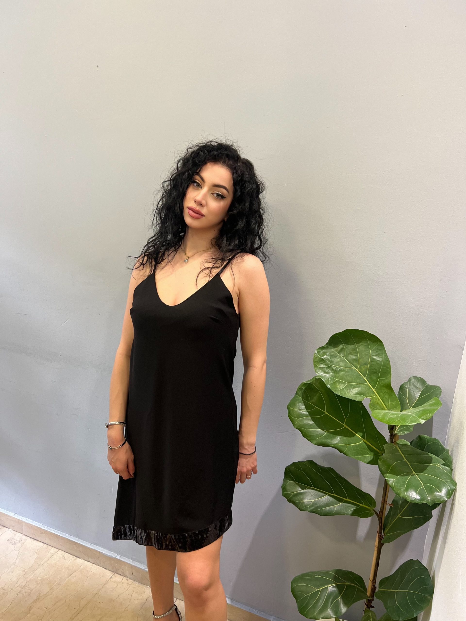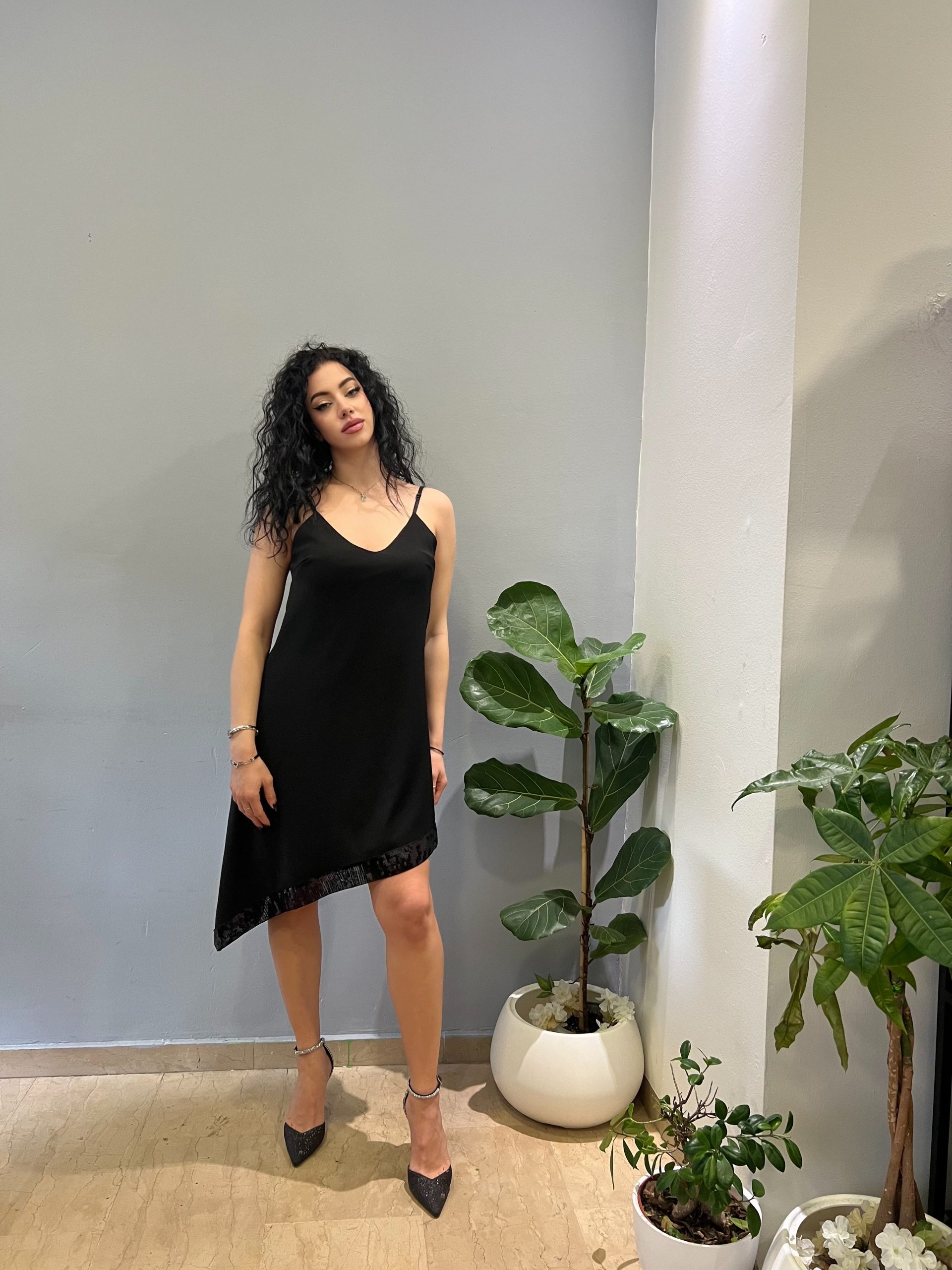 Μαύρο ασύμμετρο φόρεμα με κομψή γραμμή και διακριτική λάμψη από παγιέτες στο τελείωμα. Ιδανική επιλογή για βραδινές εμφανίσεις, προσφέρει θηλυκότητα και μοντέρνο ύφος χωρίς υπερβολές.