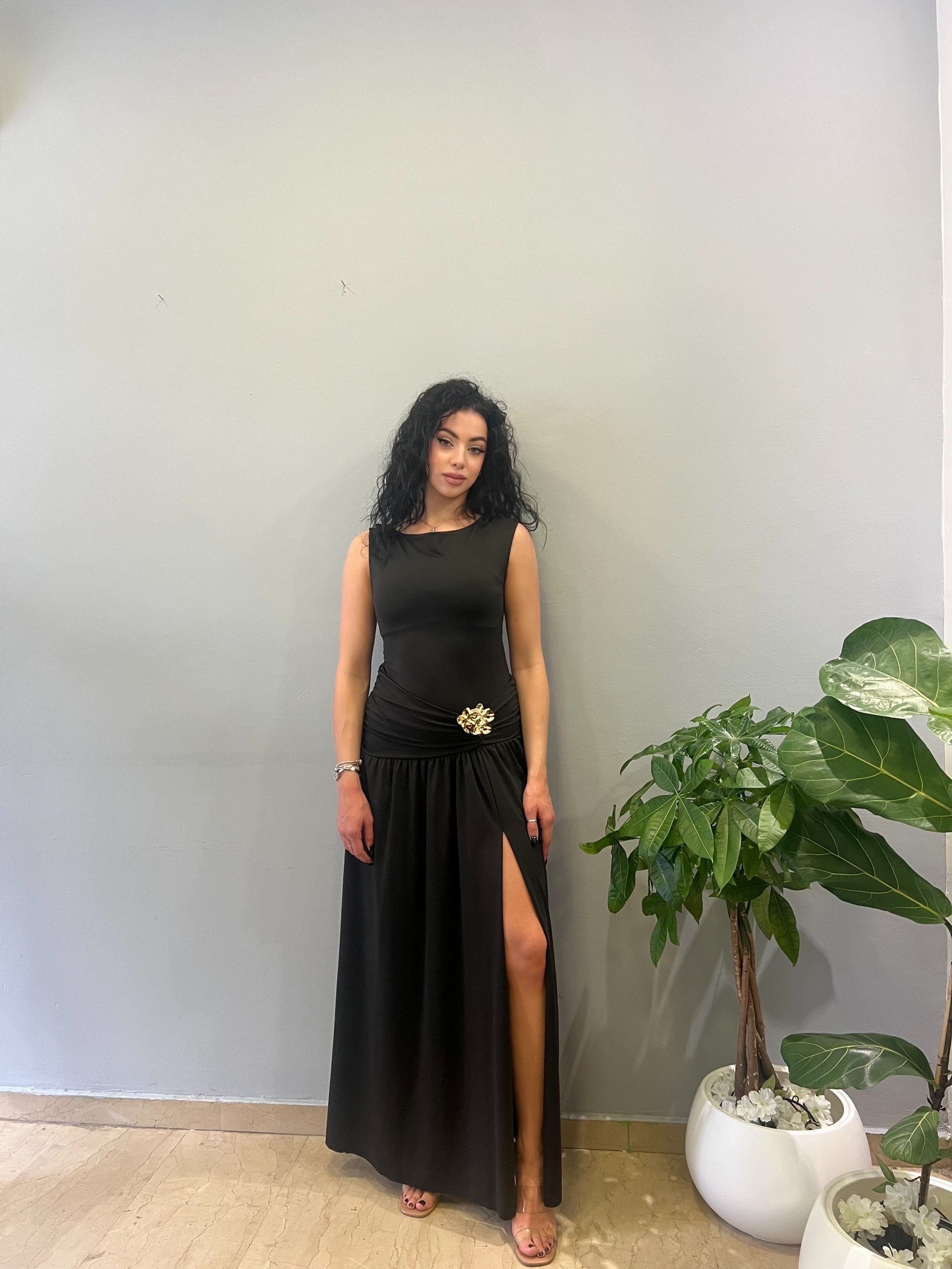 Ένα εντυπωσιακό σετ που συνδυάζει κομψότητα και θηλυκότητα. Το εφαρμοστό κορμάκι αγκαλιάζει το σώμα, ενώ η μακριά φούστα με το εντυπωσιακό σκίσιμο και τη χρυσή αγγράφα αναδεικνύει τη σιλουέτα με μοναδικό τρόπο.