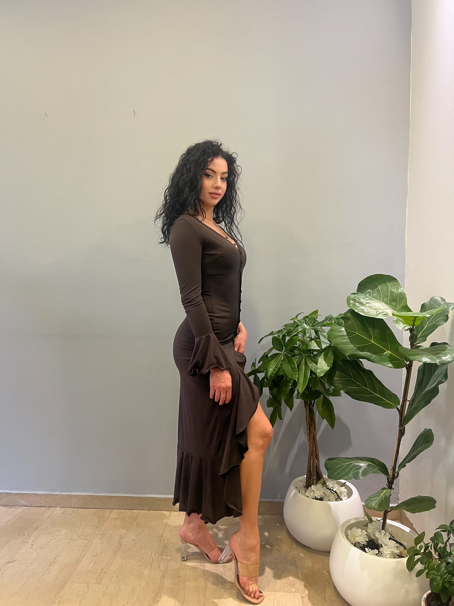 Αναδείξτε το στυλ σας με αυτό το εντυπωσιακό μακρύ ασύμμετρο φόρεμα σε βαθύ καφέ χρώμα. Διαθέτει κομψά κουμπάκια στο μπροστινό μέρος που χαρίζουν θηλυκή λεπτομέρεια, ενώ τα μανίκια με φραμπαλά προσθέτουν μία ρομαντική και αέρινη πινελιά. Το ασύμμετρο κόψιμο δημιουργεί κίνηση και ξεχωριστή γραμμή, καθιστώντας το ιδανική επιλογή τόσο για επίσημες εμφανίσεις όσο και για ιδιαίτερες εξόδους.