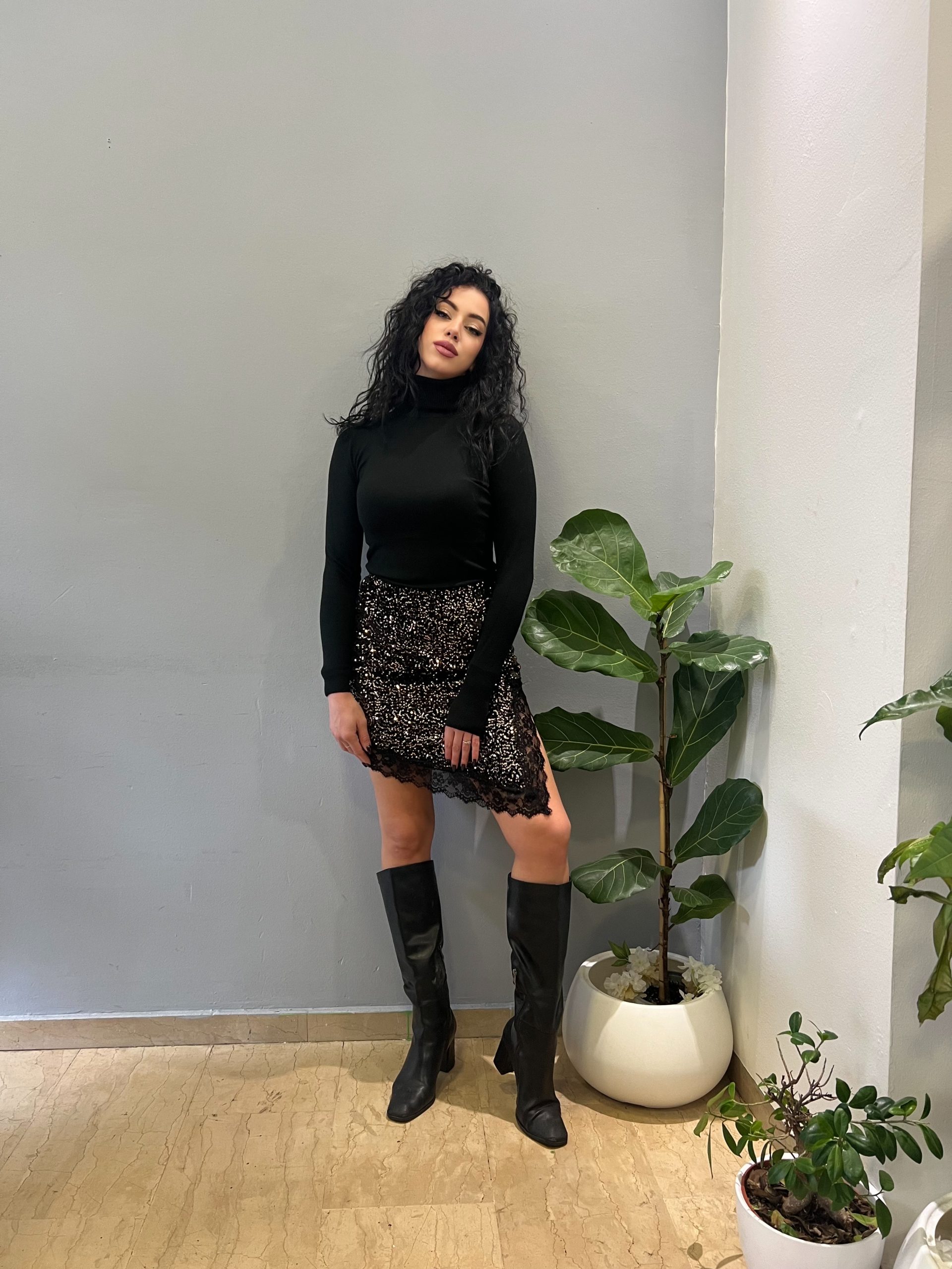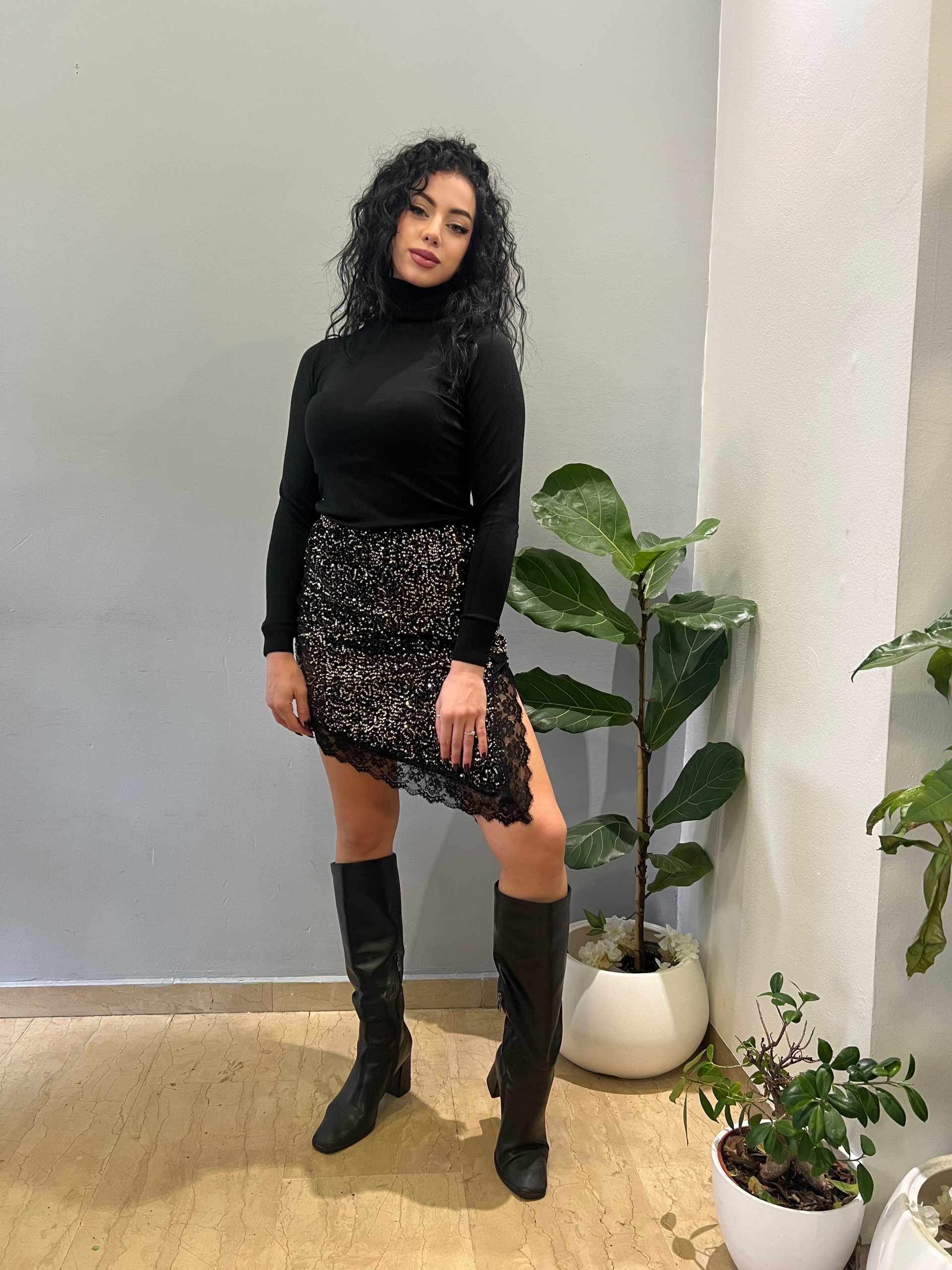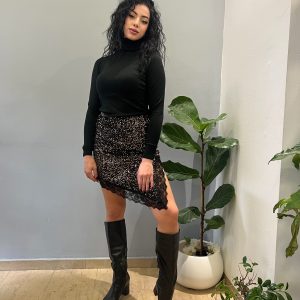 Φούστα σε παγιέτα με ασύμμετρο μήκος και δαντελωτές λεπτομέρειες στα τελειώματα. Ελαστική εφαρμογή, κατάλληλη για one size. Ιδανική για εντυπωσιακές εμφανίσεις με διακριτή λάμψη και θηλυκό χαρακτήρα.