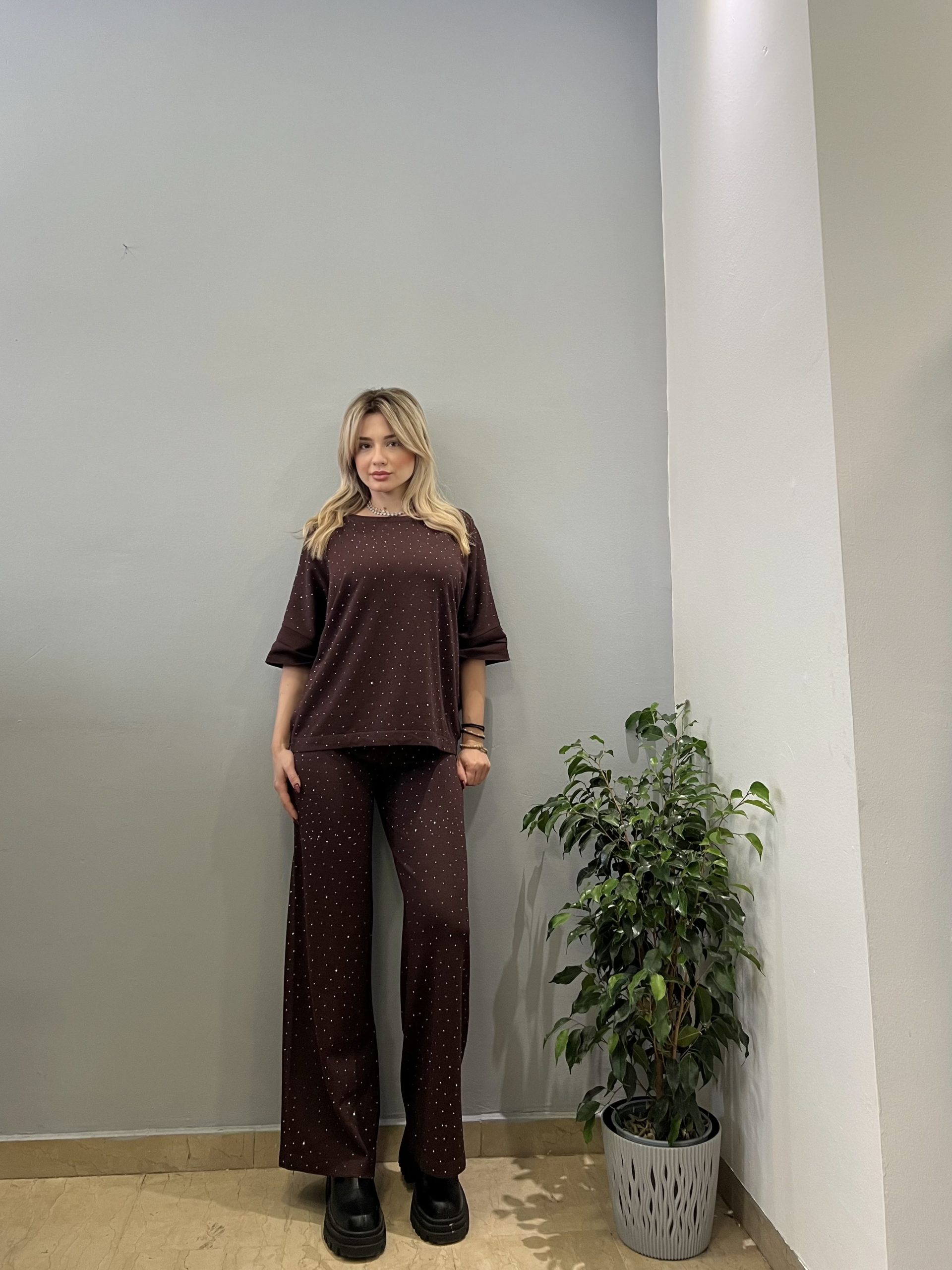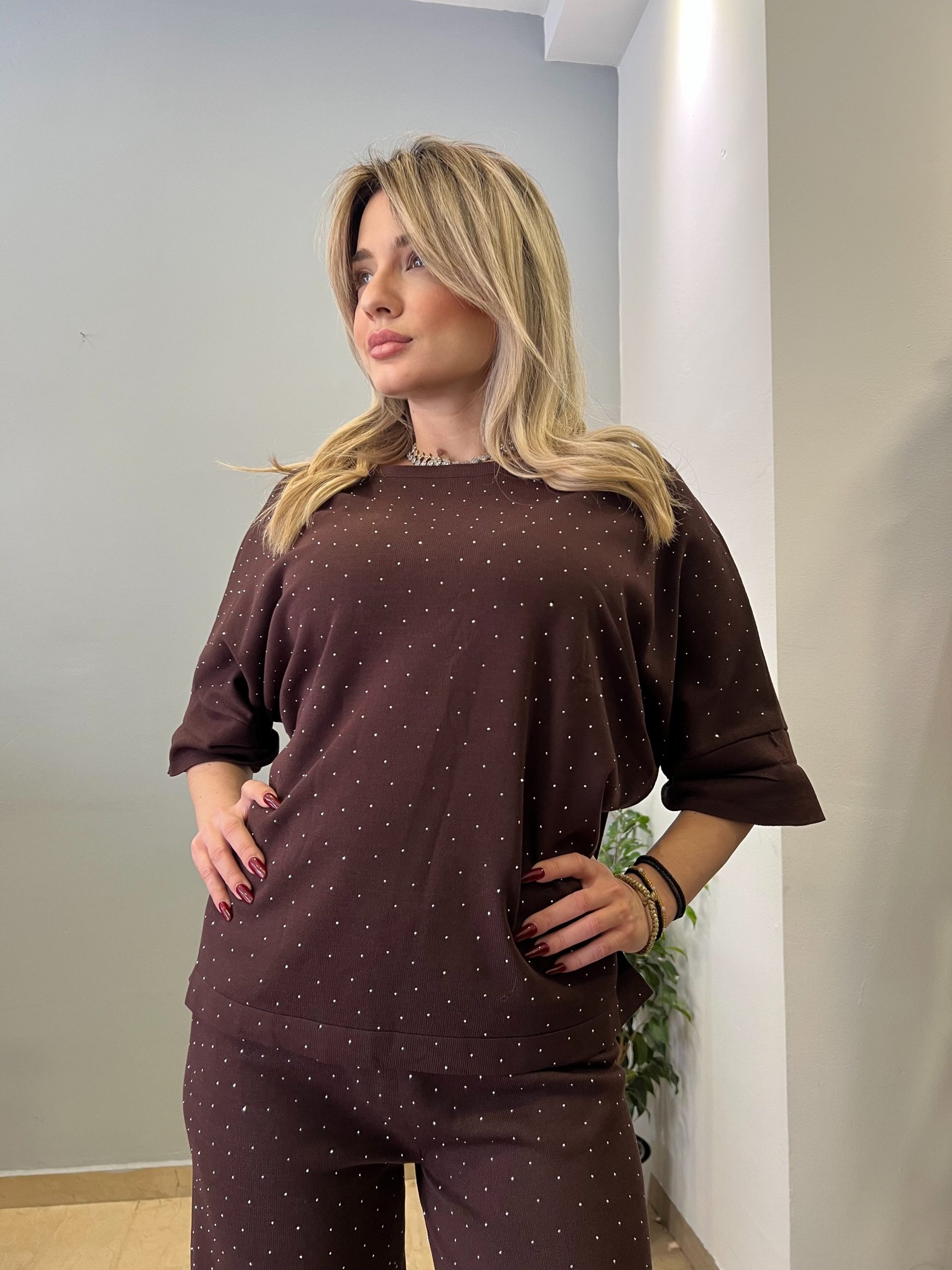 Εντυπωσιακό πλεκτό σετ με στρας, ιδανικό για κάθε στιγμή της ημέρας. Η one size γραμμή του αγκαλιάζει όμορφα το σώμα και καλύπτει άνετα μέχρι και νούμερο Large, προσφέροντας άνεση και στυλ.