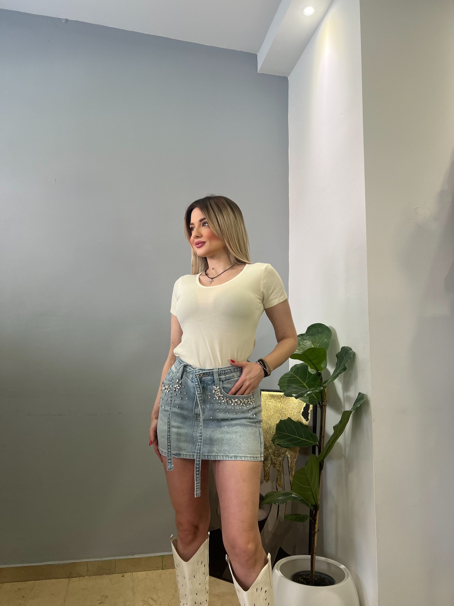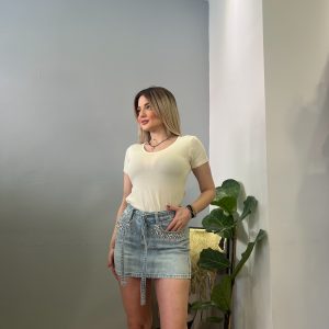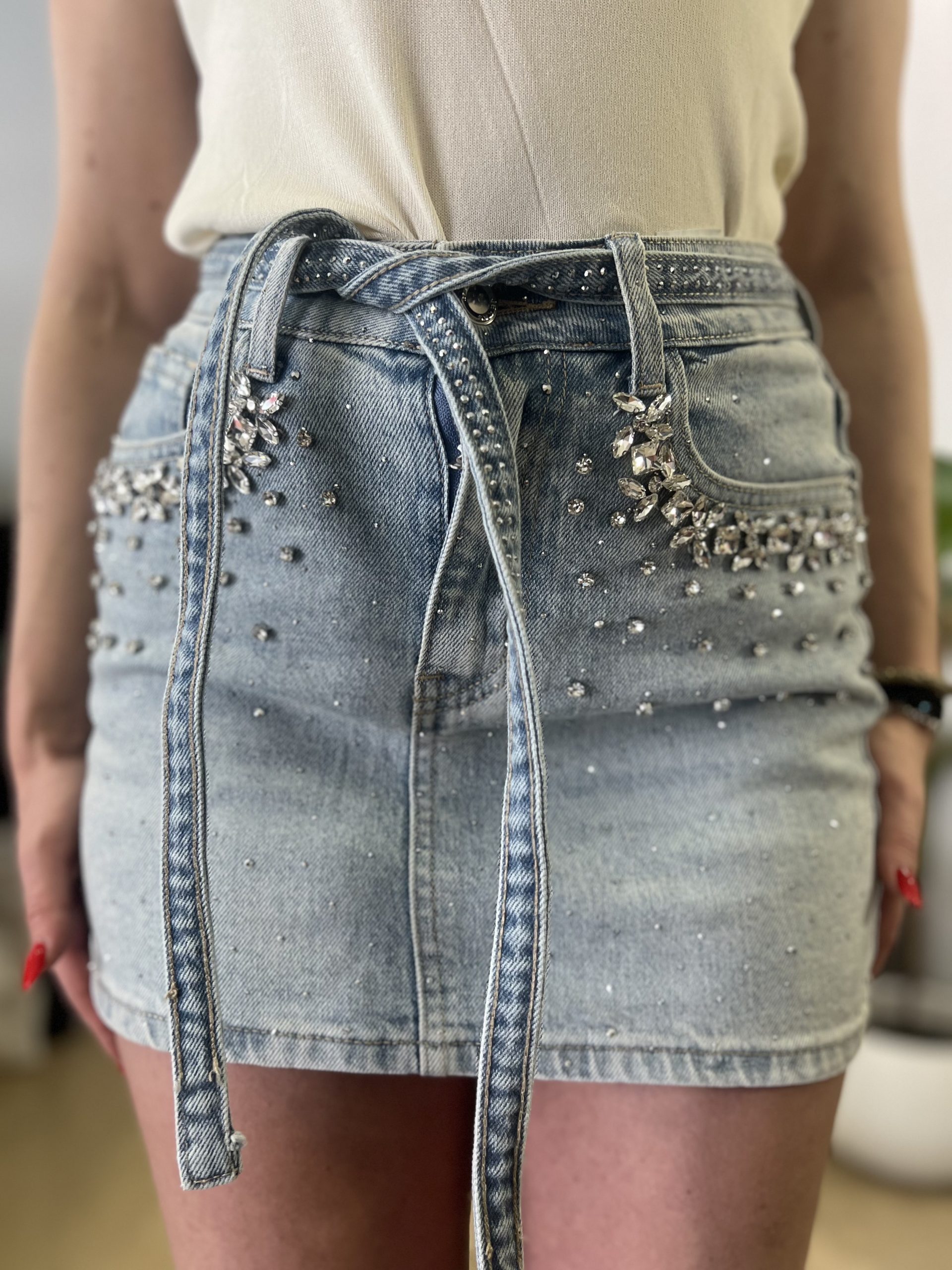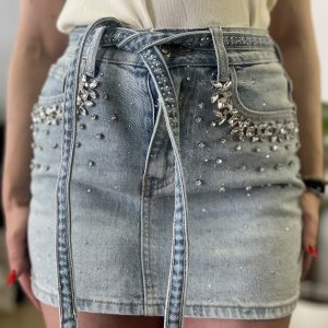 Τζιν κοντή φούστα με διακριτικά στρασάκια που χαρίζουν λάμψη και θηλυκό χαρακτήρα σε κάθε εμφάνιση. Το κλασικό denim ύφασμα συνδυάζεται με μοντέρνες λεπτομέρειες, ενώ το ζωνάκι αναδεικνύει τη μέση και προσφέρει άψογη εφαρμογή.