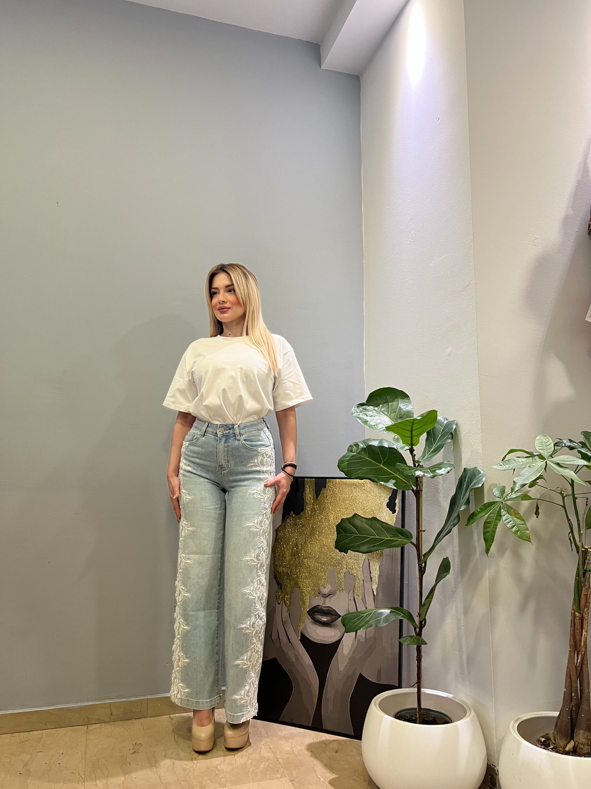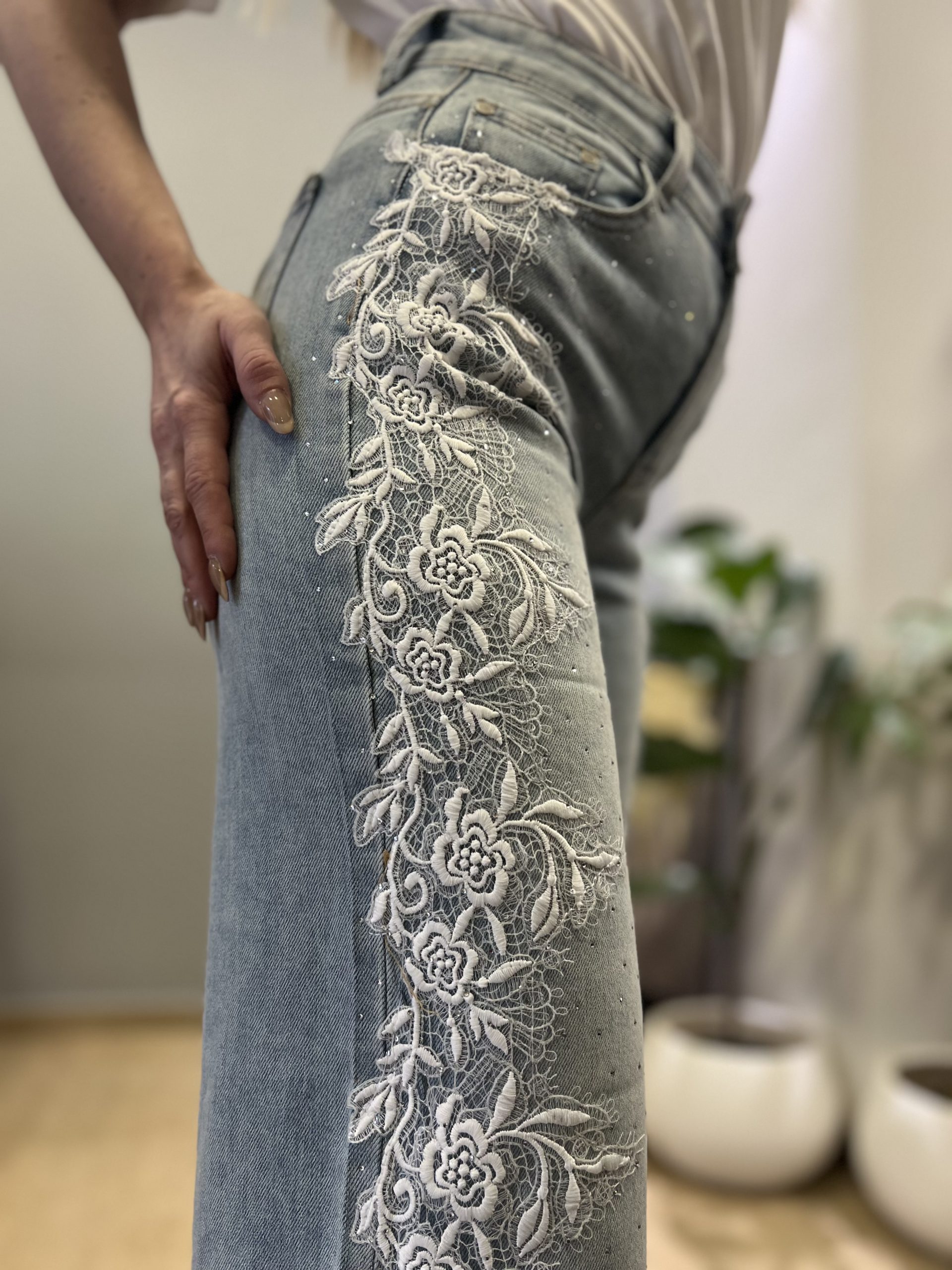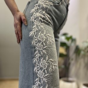 Γυναικείο τζιν που συνδυάζει το casual στυλ με διακριτικές, θηλυκές λεπτομέρειες. Διαθέτει λευκή δαντέλα στα πλάγια που προσθέτει ρομαντική πινελιά, ενώ τα μικρά στρας χαρίζουν μια διακριτική λάμψη σε κάθε σας εμφάνιση. Άνετη εφαρμογή και ελαστικό ύφασμα για τέλεια εφαρμογή όλη μέρα. Ιδανικό για καθημερινά αλλά και πιο προσεγμένα looks, φοριέται εύκολα από το πρωί έως το βράδυ.