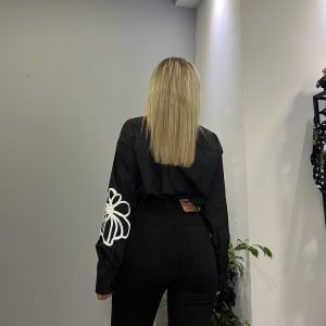 Μαύρο πουκάμισο one size με κομψό σχέδιο από λευκό λουλούδι στο μανίκι και στο μπροστινό μέρος. Απαλή υφή, άνετη εφαρμογή και στυλ που ταιριάζει σε κάθε περίσταση — από καθημερινές εμφανίσεις μέχρι πιο ιδιαίτερες στιγμές. Ένα διαχρονικό κομμάτι που προσθέτει θηλυκότητα και φινέτσα στην εμφάνισή σας.