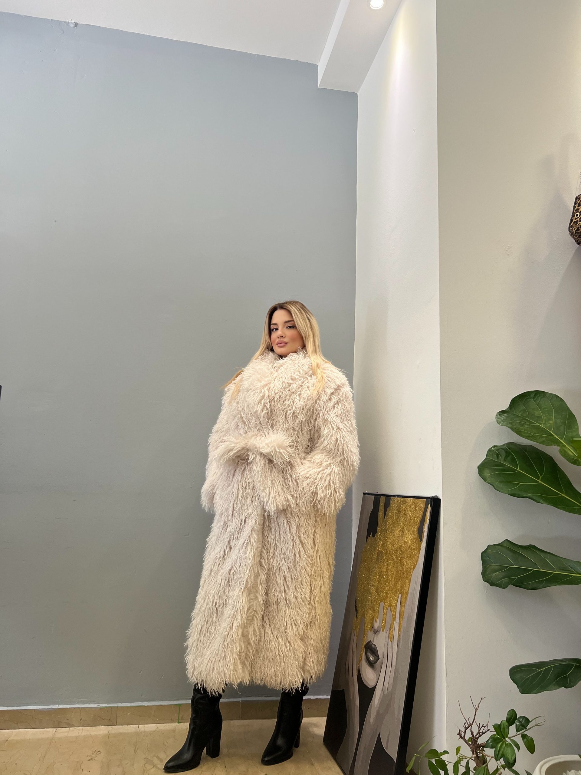 Λευκή μακριά γούνα Lumina με ζώνη στη μέση. Κομψή και άνετη επιλογή για καθημερινές και πιο ιδιαίτερες εμφανίσεις.
