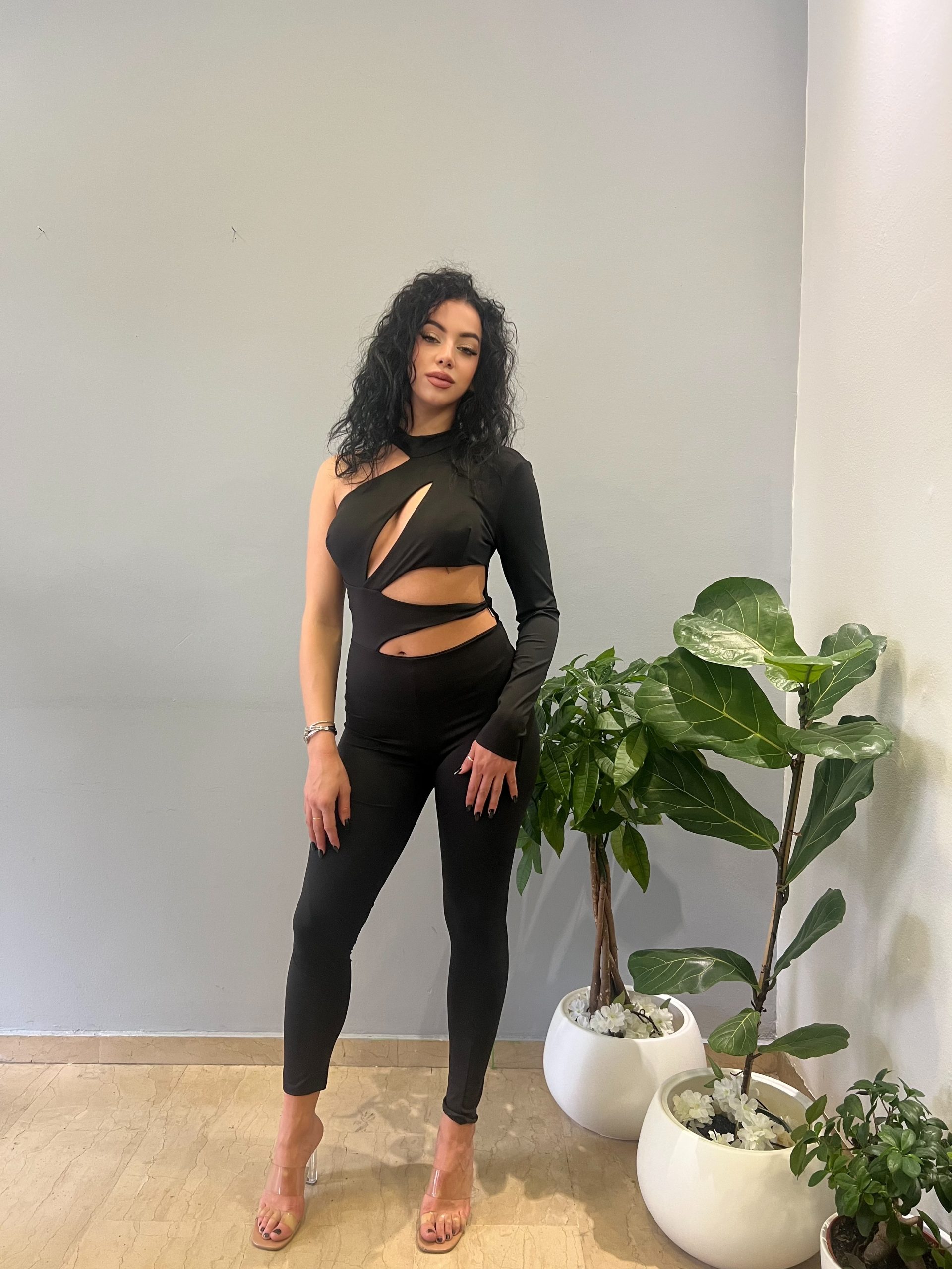Μαύρη ολόσωμη φόρμα με ελαστικό ύφασμα και εντυπωσιακά ανοίγματα στο μπροστινό μέρος. Είναι one size και ιδανική για πιο βραδινές εμφανίσεις.